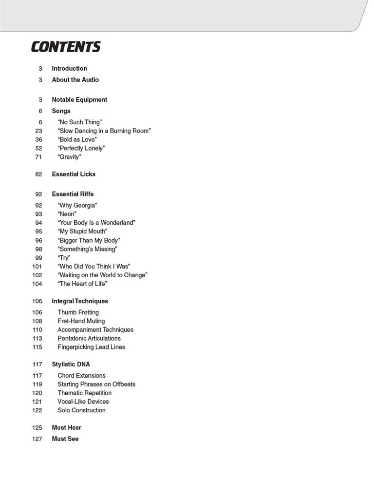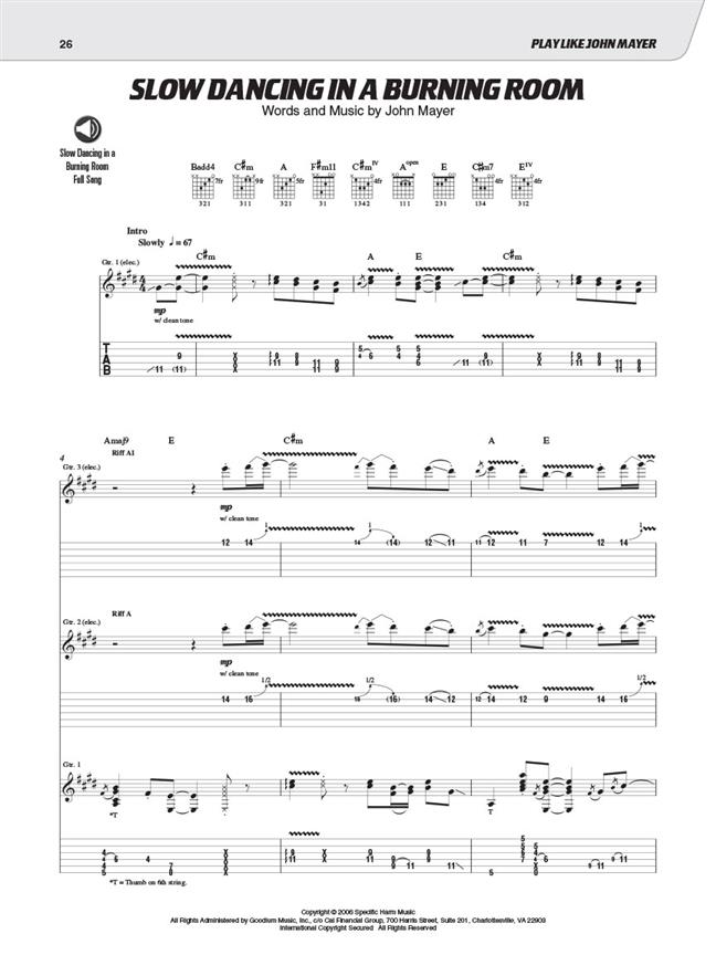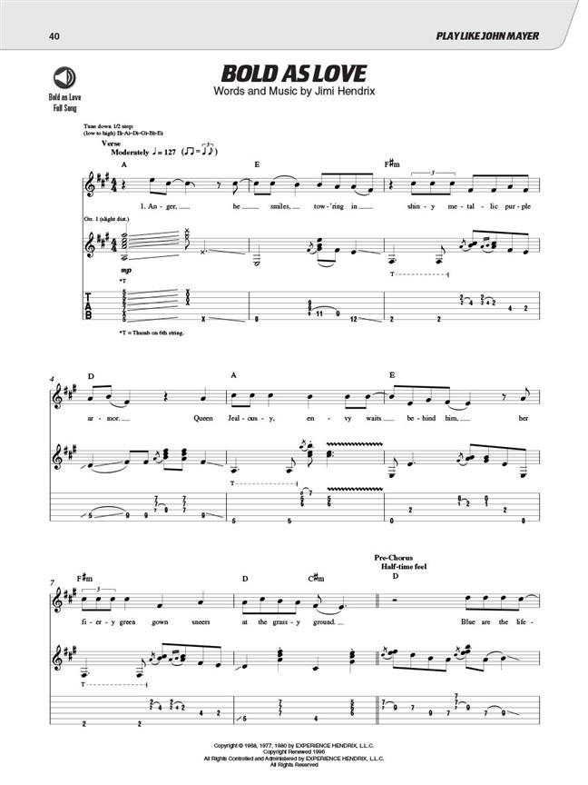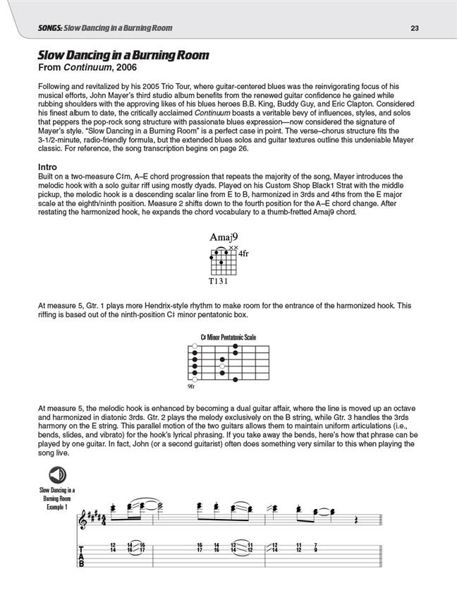 With this volume in the Play Like... series, you can study the trademark songs, licks, tones, and techniques of singer/songwriter and master guitarist John Mayer . This comprehensive book and audio teaching method provides detailed analysis of Mayer' s gear, tone, techniques, styles, songs, licks, riffs and much more. You'll learn everything you need to know about his renowned Guitar playing, from his pop styles to his authentic blues chops and beyond. The price of this book includes access to audio tracks online, for download or streaming, using the unique code inside the book. This book also includes Playback+, a multi-functional audio player that allows you to slow down audio without changing pitch, set loop points, change keys and pan left or right. Play Like John Mayer: The Ultimate Guitar Lessonfeatures lessons from 15 songs spanning Mayer 's entire career as well as five full songs: Bold as Love, Gravity, No Such Thing, Perfectly Lonely and Slow Dancing in a Burning Room .