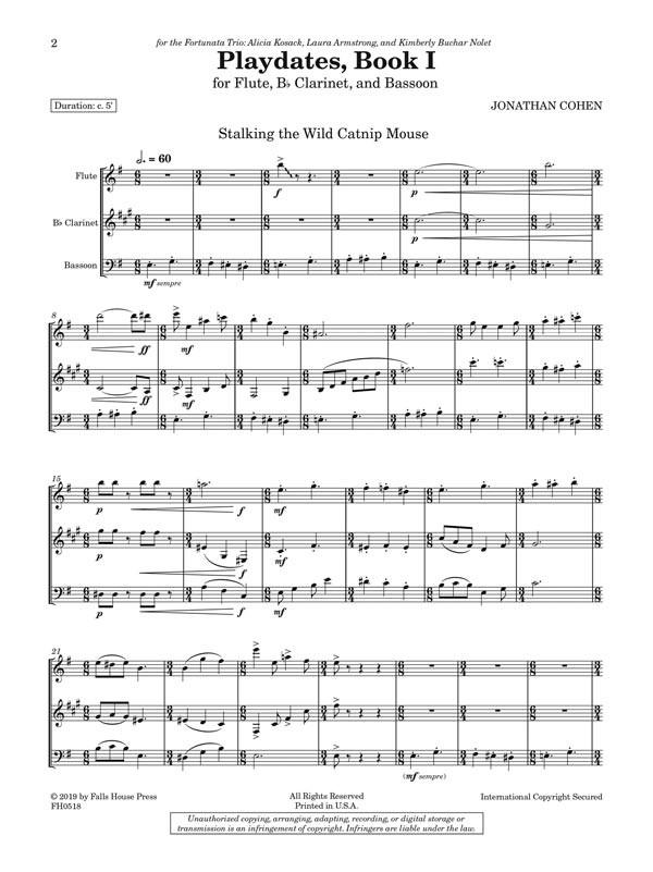 Cohen's compositions for flute ensembles, ranging from duets through large choirs, are well known and frequently performed. Less familiar than his flute chamber music is a treasure chest of gems for mixed wind trio, mostly written for the Fortunata Trio. Playdates, Book I introduces three of these short, charming works: Stalking the Wild Catnip Mouse, I'm Skipping, Even If Everyone Is Watching, and But I Always Have This Much Sugar for Breakfast! Cohen's compositions for flute ensembles, ranging from duets through large choirs, are well known and frequently performed. Less familiar than his flute chamber music is a treasure chest of gems for mixed wind trio, mostly written for the Fortunata Trio. Playdates, Book I introduces three of these short, charming works: Stalking the Wild Catnip Mouse, I'm Skipping, Even If Everyone Is Watching, and But I Always Have This Much Sugar for Breakfast!