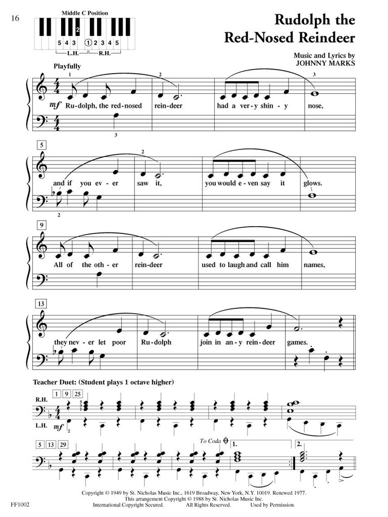Chants de Noël et chansons préférés arrangés pour le pianiste débutant. Le contenu comprend : Jingle Bells - Ô Venez, Tous les Fidèles (Adeste Fideles) - Quand le Père Noël reçoit votre lettre - Nuit douce - Partie dans une mangeoire - Le premier Noël - Joie du monde - Rudolph le renne au nez rouge - Un Noël joyeux et joyeux - La chanson de la veille de Noël - Balancement autour du sapin de Noël - Nous vous souhaitons un joyeux Noël.