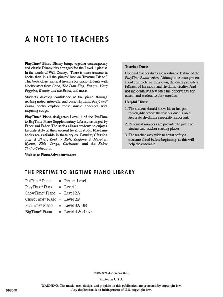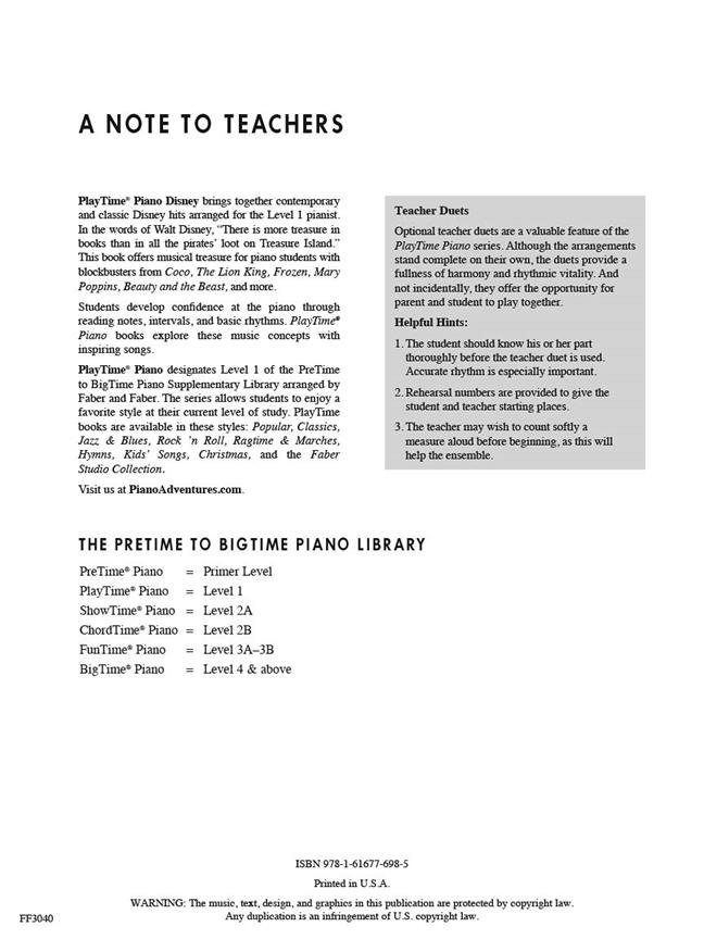 PlayTime Piano Disney brings together contemporary and classic Disney hits arranged for the Level 1 pianist. Students build confidence reading notes, intervals, and basic rhythms, all while playing inspiring songs from blockbusters including Coco, Beauty and the Beast, The Little Mermaid, and more. Songs include: Beauty and the Beast - Gaston (Beauty and the Beast) - Gummi Bears Theme (Adventures of the Gummi Bears) - I Just Can't Wait to Be King (The Lion King) - Let It Go (Frozen) - Let's Go Fly a Kite (Mary Poppins) - Part of Your World (The Little Mermaid) - Remember Me (Ernesto de la Cruz) (Coco) - A Spoonful of Sugar (Mary Poppins).