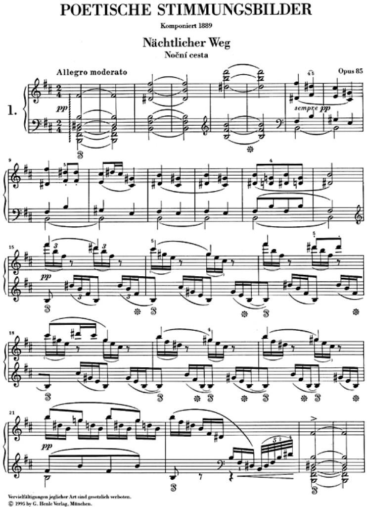 Les oeuvres pour piano d’Antonín Dvorák sont en général moins connues que ses symphonies et ses oeuvres de musique de chambre, d’autant que celles qu’il composa vers 1880 dénotent une certaine proximité avec celles de Schubert, Chopin ou Schumann. La situation est différente si l’on considère les tableaux sonores romantiques plus tardifs de son opus 85, intitulés «Treize Impressions poétiques». Les pianistes à la recherche d’oeuvres poétiques et romantiques sortant des sentiers battus trouveront sans doute beaucoup de plaisir à jouer ce grand cycle pour piano de Dvorák datant de 1889, en particulier la pièce très impressionnante intitulée «Au vieux château» ou encore la«Ballade paysanne» pleine d’entrain. Pour notre édition urtext, l‘éditeur et spécialiste de Dvorák Milan Pospíšil s’est appuyé sur le manuscrit autographe ainsi que sur la première édition parue l’année de la composition de l’oeuvre.