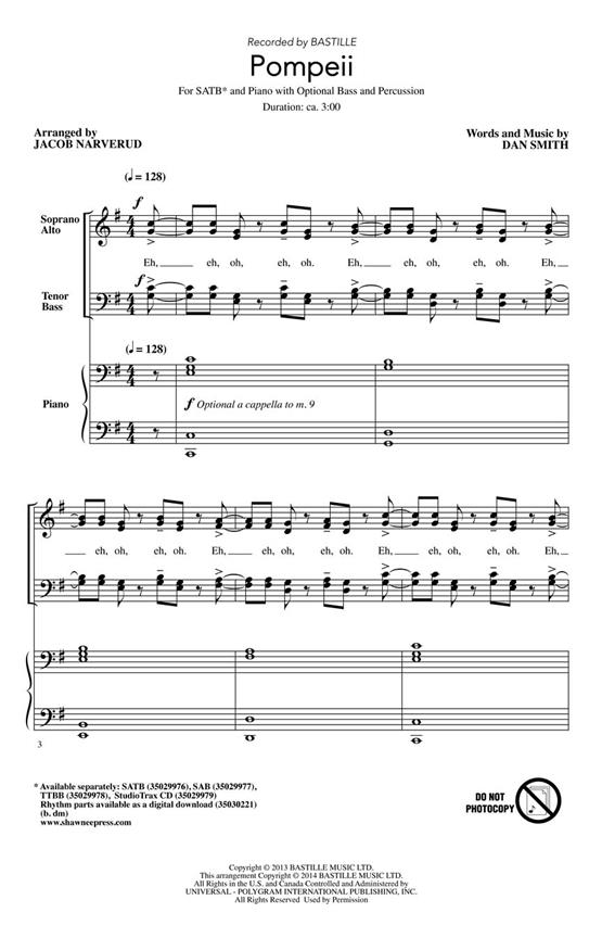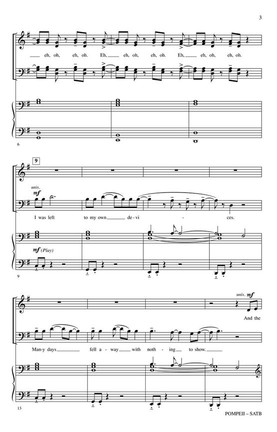 A hit in the USA by British rock band Bastille, this song is about the Roman town of the same name, which met its fate with the eruption of Mount Vesuvius. Vocal rhythms and harmonies, bass, percussion and supportive, yet optional piano, recreate this pop tune into a choral masterpiece. ScorePlay - click to view score with recording.