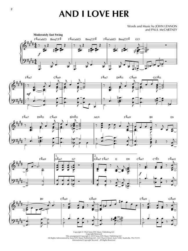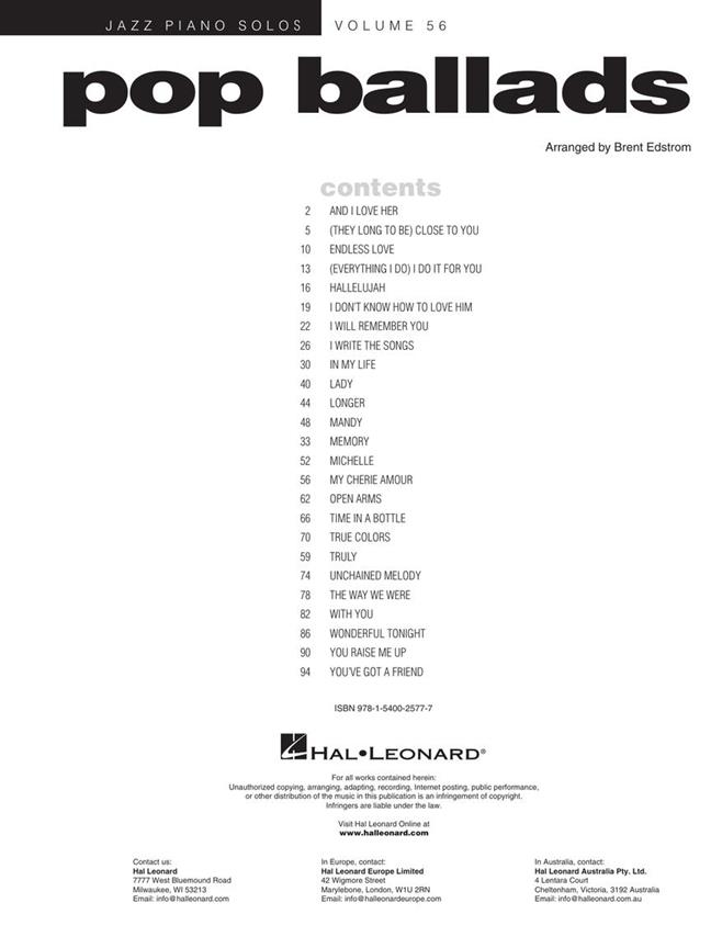 25 jazzy piano solo arrangements of pop ballads, including: And I Love Her · (They Long to Be) Close to You · Endless Love · Hallelujah · I Don't Know How to Love Him · I Will Remember You · I Write the Songs · In My Life · Lady · Longer · Memory · Open Arms · True Colors · Unchained Melody · Wonderful Tonight · You Raise Me Up · You've Got a Friend · and more.