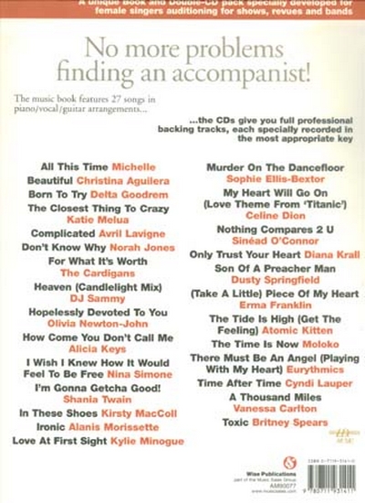 A unique book and double-CD pack specially developed for female singers auditioning for shows, revues and bands. The music book features twenty-seven songs in piano/vocal/guitar arrangements. The CDs give you full professional backing tracks, each specially recorded in the most appropriate key. Includes hits by Dusty Springfield, Celine Dion, Olivia Newton-John and Britney Spears.