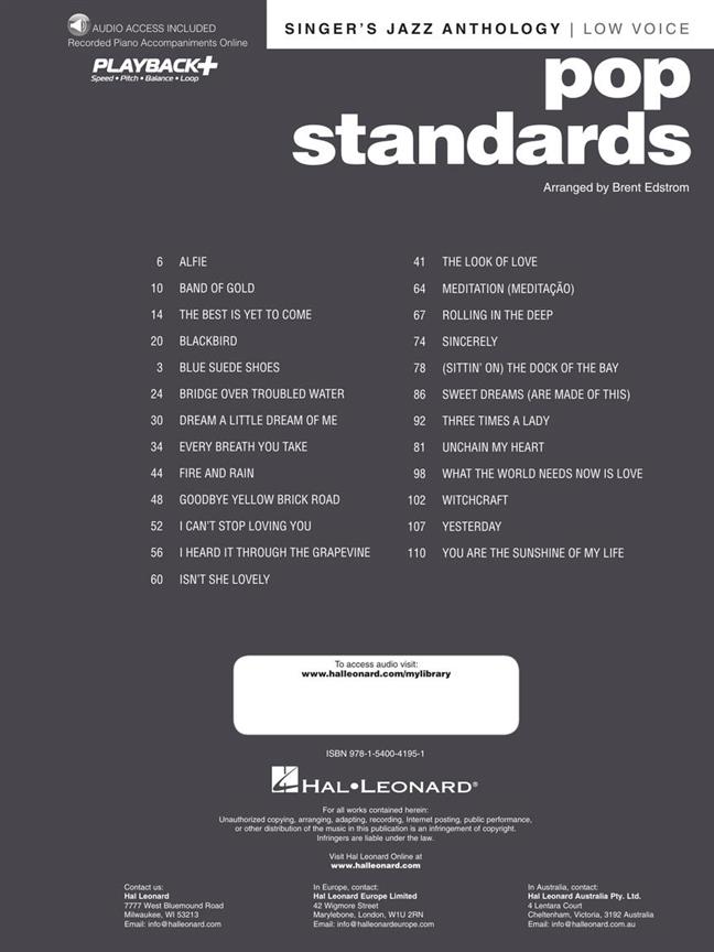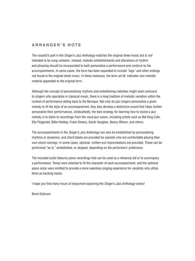 The Singer's Jazz Anthology is an exciting new series providing aspiring jazz vocalists and pianists with staples of the jazz repertoire. The singer's portion, matching the original sheet music, is paired with fresh, unique accompaniments arranged in an authentic jazz style and designed to enable the singer to sound like they're being backed by an accomplished jazz pianist. The accompaniments can be performed as written but include chord labels for pianists who are comfortable playing their own chord voicings. This book also includes access to recordings of the series arranger, Brent Edstrom, playing the piano accompaniments for use in rehearsal or performance. This edition features 25 must-know pop standards, including: Alfie · Blackbird · Bridge over Troubled Water · Dream a Little Dream of Me · Every Breath You Take · Fire and Rain · Goodbye Yellow Brick Road · Isn't She Lovely · Rolling in the Deep · (Sittin' On) The Dock of the Bay · Three Times a Lady · What the World Needs Now Is Love · Yesterday · and more.