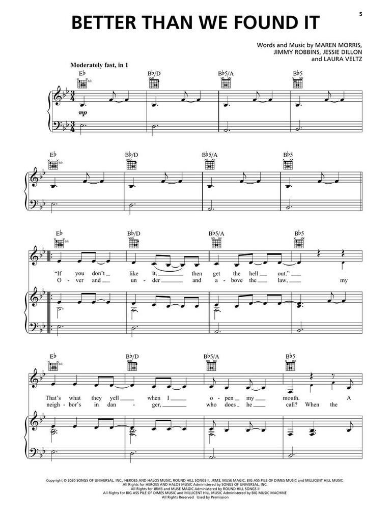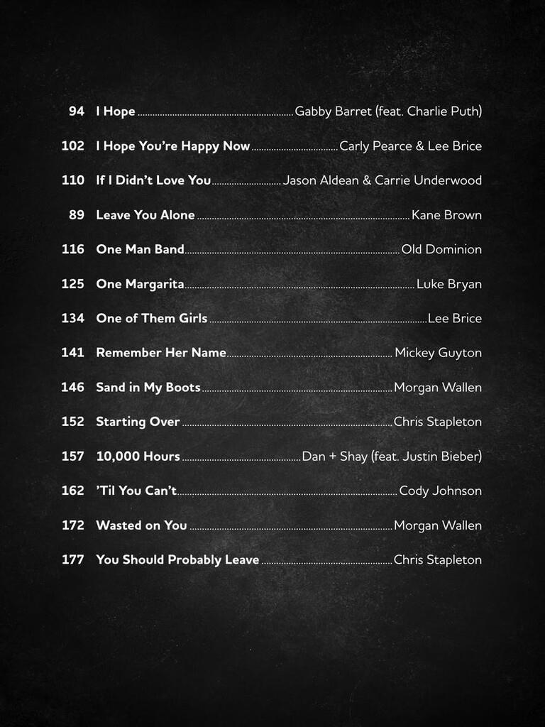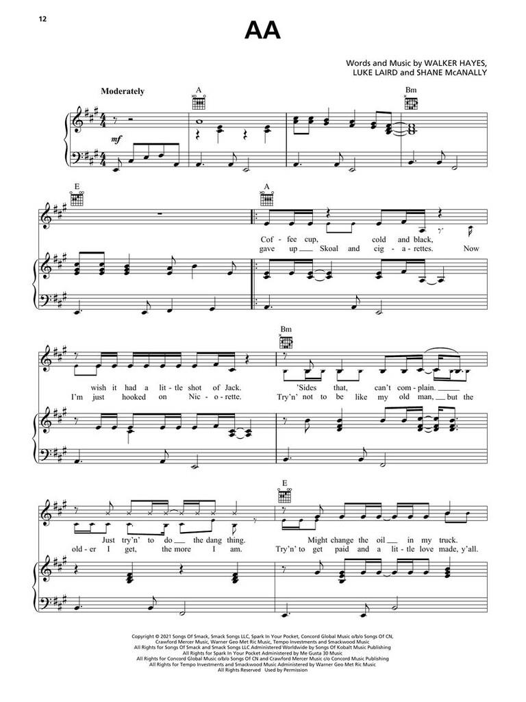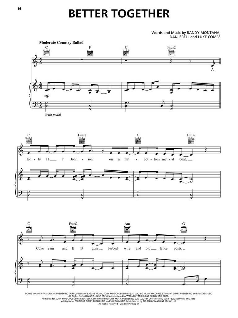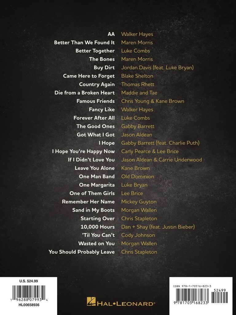 This collection features nearly 30 of the top country hits from 2020 through 2022 from artists including Jason Aldean, Gabby Barrett, Luke Bryan, Luke Combs, Walker Hayes, Maren Morris, Blake Shelton, Chris Stapleton, Morgan Wallen, and more! Each song is arranged for piano and voice with chord frames.