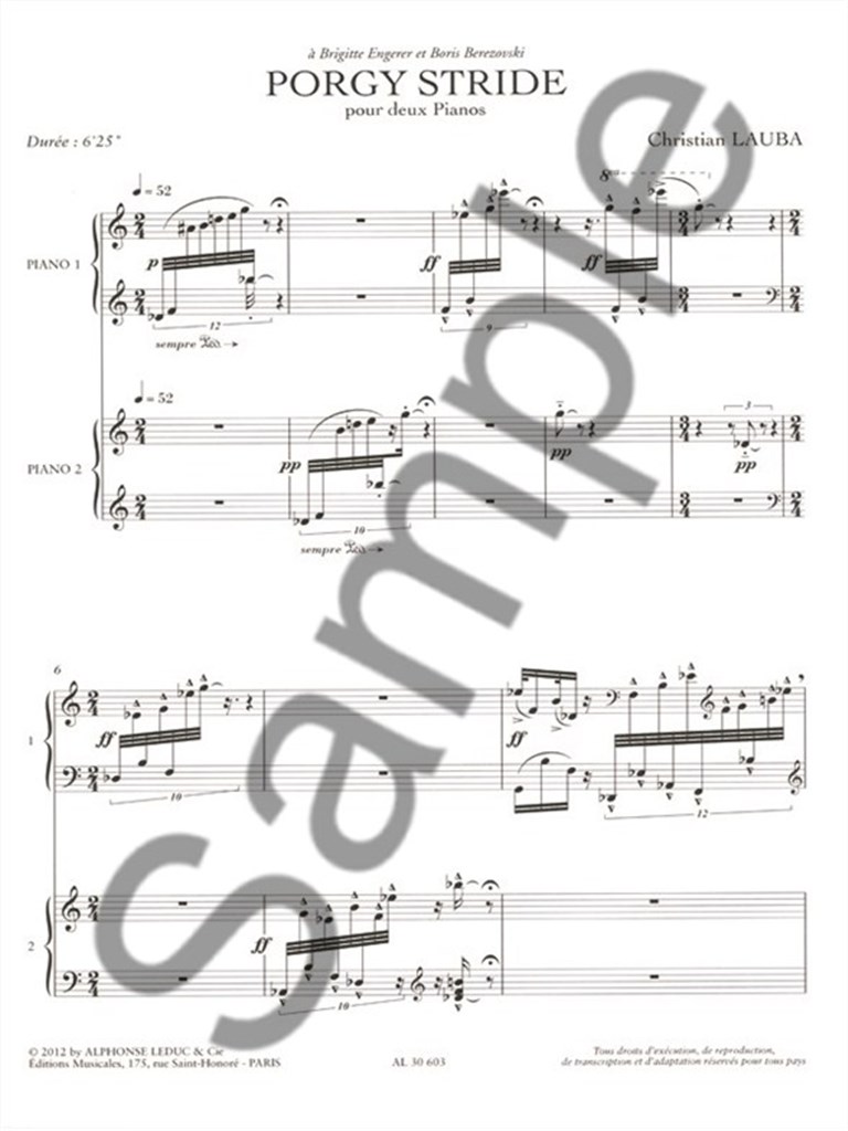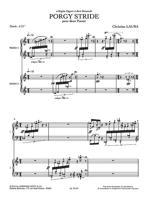Born in Tunisia in 1952, Christian Lauba has been a prominent contemporary composer, winning many prizes since his graduation from the Conservatory of Bordeaux during the mid-1980s. Lauba won First Prize for Composition during his studies and his Porgy Stride for Two Pianos proves his ability. Published in 2012, a typical performance of Porgy Stride takes around 6 minutes and 25 seconds. The work is highly virtuosic and modern, exploiting tonality, rhythm and other advanced technical features. The score of Porgy Stride comes with clear, separate parts for each performer. For all advanced pianists, Porgy Stride provides an alternative, modern work, essential to a varied duetrepertoire.