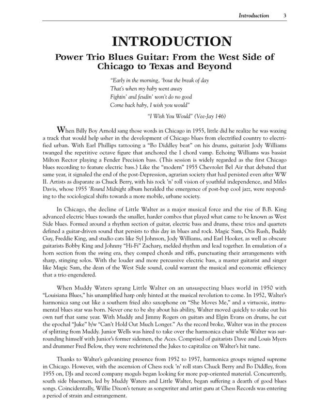 Ce pack de livre/CD détaille comment jouer de la guitare électrique dans un trio avec contrebasse et batterie. Boogie, shuffle et rythmes blues lent, licks, double les patrons s'arrête, cordes et basse sont présentées pour les blues complet et passionnant. Un CD avec les exemples de musique interprétée par un power trio smokin'est inclus pour le long de jeu d'instruction et de brouillage. Les styles de musique de Chicago et Texas bluesmen sont présentés avec des photos rares de ces musiciens avec leurs axes préférés. Cette nouvelle édition comporte encore plus les styles blues - funk, soul et jazz - tous avec des enregistrements et de nouveaux exemples de musique !