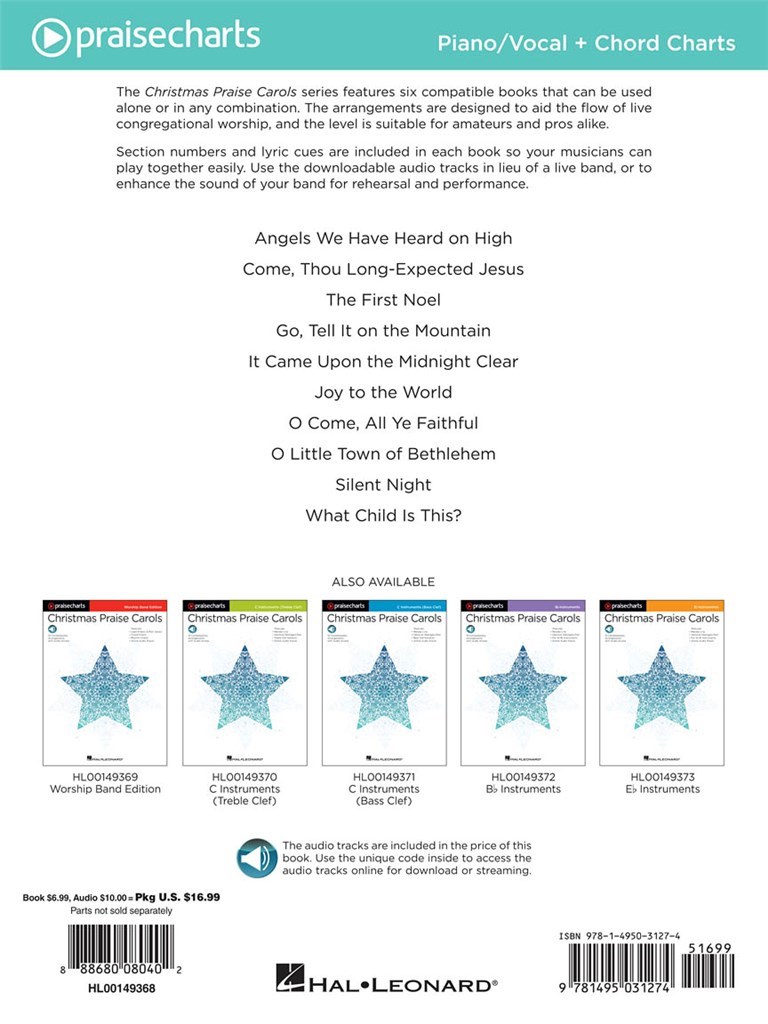The Christmas Praise Carols series features six compatible books that can be used alone or in any combination. The arrangements are designed to aid the flow of live congregational worship, and the level is suitable for amateurs and pros alike. Section numbers and lyric cues are included in each book so your musicians can play together easily. Use the audio tracks in lieu of a live band, or to enhance the sound of your band for rehearsal and performance. The audio tracks are accessed online using the unique code in each book. The tracks can be streamed or downloaded according to personal preference. Songs include: Angels We Have Heard on High - Come, Thou Long-Expected Jesus - The First Noel - Go, Tell It on the Mountain - It Came upon the Midnight Clear - Joy to the World - O Come, All Ye Faithful - O Little Town of Bethlehem - Silent Night - What Child Is This?