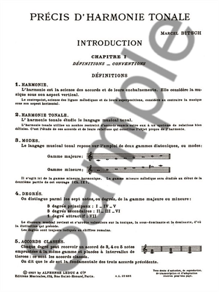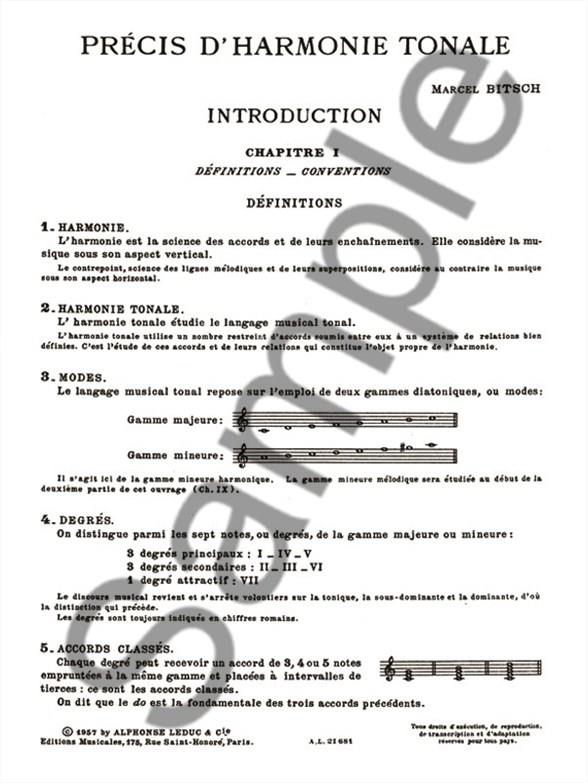 Born in Toulouse, Marcel Bitsch (1921-2011) went on to study at the Paris Conservatoire before becoming a professor of counterpoint at the institution. As an exceptionally versatile musician, Bitsch has composed orchestral works, chamber works, numerous pieces and studies for wind instruments, as well as theory books. Precis D'Harmonie Tonale is a significant addition to the theoretical study of harmony. Accessible for beginner to advanced musicians, Bitsch 's Precis D'Harmonie Tonale addresses a variety of technical, harmonic elements. These include chords, intervals, inversions, figured bass, cadences, modulations and suspensions, among many other aspects. Bitsch 's Precis D'Harmonie Tonale includes all of the harmonic devices required in the theoretical study of the element. Precis D'Harmonie Tonale is an outstanding and necessary accompaniment to all harmony studies.