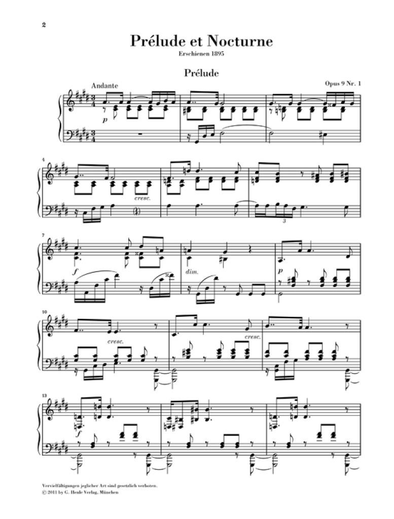 En été 1891, Scriabine, s'étant trop exercé, blessa sa main droite. Il dut pour cette raison faire travailler uniquement sa main gauche, pour laquelle il écrivit en 1894 son Prélude et Nocturne op. 9. Les deux pièces furent publiées l'année suivante et jouirent rapidement d'une grande considération. En 1906, elles étaient même si populaires aux Etats-Unis, que Scriabine rapporta de New York: "Il s'est avéré que l'éditeur local a réimprimé mon Nocturne pour la main gauche et que des milliers d'exemplaires sont déjà vendus [...] Ma popularité est immense!"