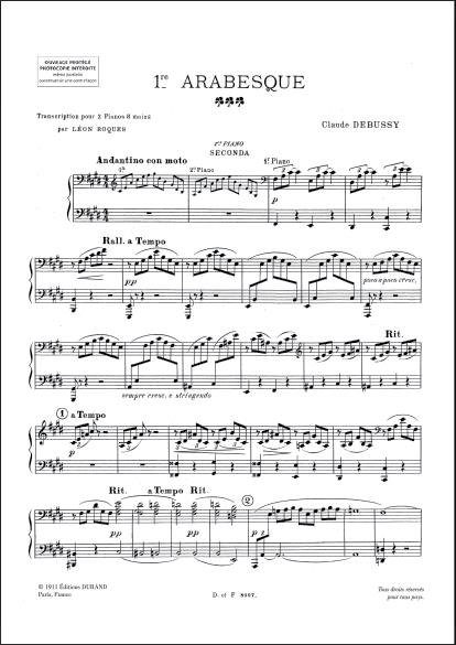 Première arabesque de Claude Debussy. Transcription pour 2 pianos à 8 mains par Leon Roques.