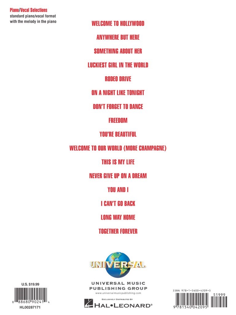 16 selections in standard piano/vocal format with the melody in the piano part from this 2018 Broadway musical based on the story of the 1990 film of the same name, composed by Bryan Adams and Jim Vallance. Includes: Anywhere but Here · Don't Forget to Dance · Freedom · I Can't Go Back · Long Way Home · Luckiest Girl in the World · Never Give up on a Dream · On a Night like Tonight · Rodeo Drive · Something About Her · This Is My Life · Together Forever · Welcome to Hollywood · Welcome to Our World (More Champagne) · You and I · You're Beautiful.