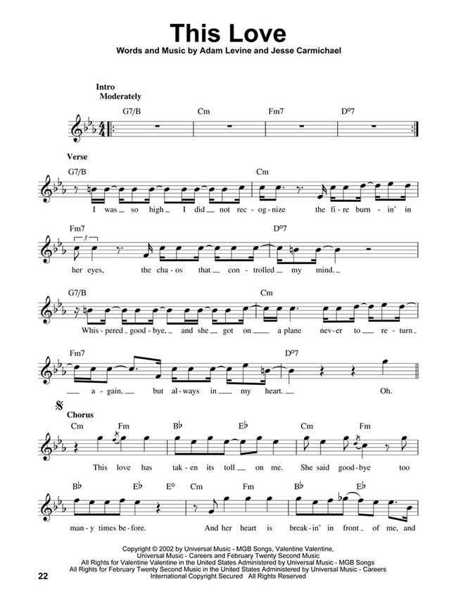 Avec les deux premiers classiques tels que She Will Be Loved coups et modernes tels que Moves Like Jagger, le livre contient les paroles, la mélodie, et les symboles d'accord pour huit grandes chansons de Maroon 5.