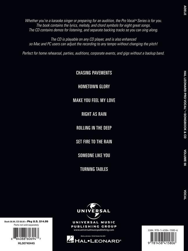 Que vous soyez un chanteur de karaoké ou la préparation à une audition, la série Pro Vocal est fait pour vous! Le livre contient les paroles, la mélodie et les symboles d'accord pour huit chansons à succès. Le CD contient des démos pour écouter, et les pistes d'accompagnement séparée afin que vous puissiez chanter en même temps. Le CD est jouable sur n'importe quel lecteur CD, et a également amélioré afin que les utilisateurs PC et Mac est possible de régler l'enregistrement à n'importe quelle hauteur sans changer le tempo! Parfait pour les répétitions à domicile, les partis, des auditions, des événements corporatifs, et les concerts sans une bande de sauvegarde.