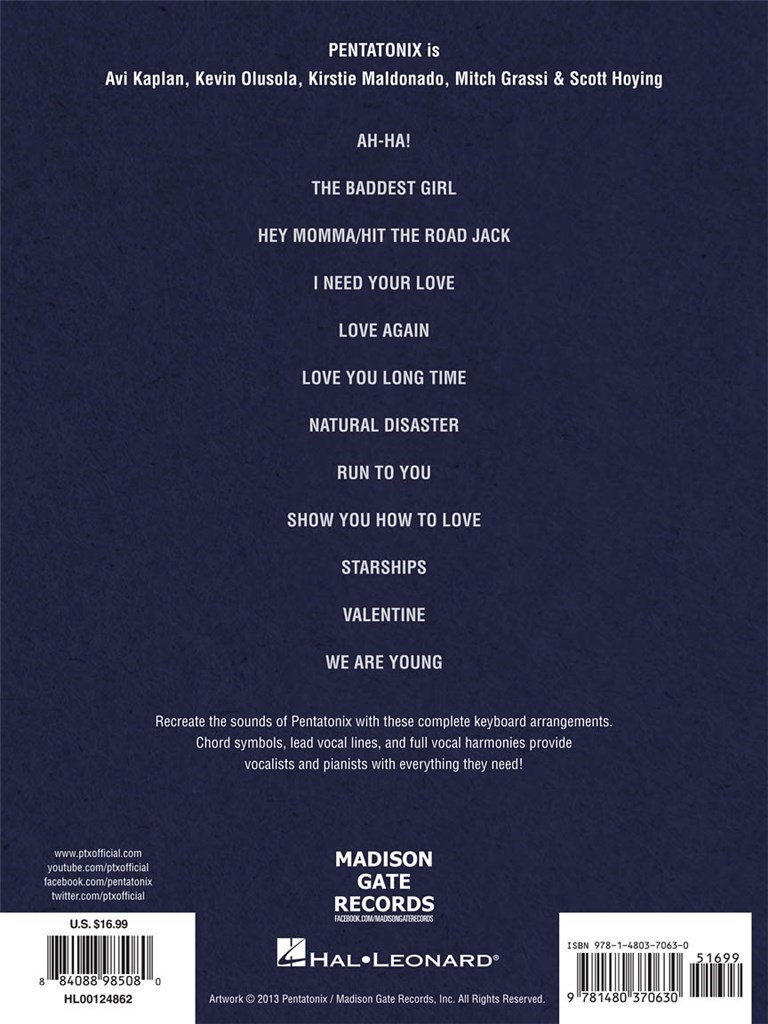 Lauréats de la troisième saison de The Sing-Off sur NBC, ce troisième album du groupe texan a cappella Pentatonix est présenté ici dans des arrangements avec des symboles d’accords, des lignes vocales principales et les harmonies vocales complètes transcrites dans la partie piano. Les chansons incluent : Hey Momma/Hit the Road Jack · J’ai besoin de ton amour · Love Again · Catastrophe naturelle · Run to You · Valentine · et plus encore.
