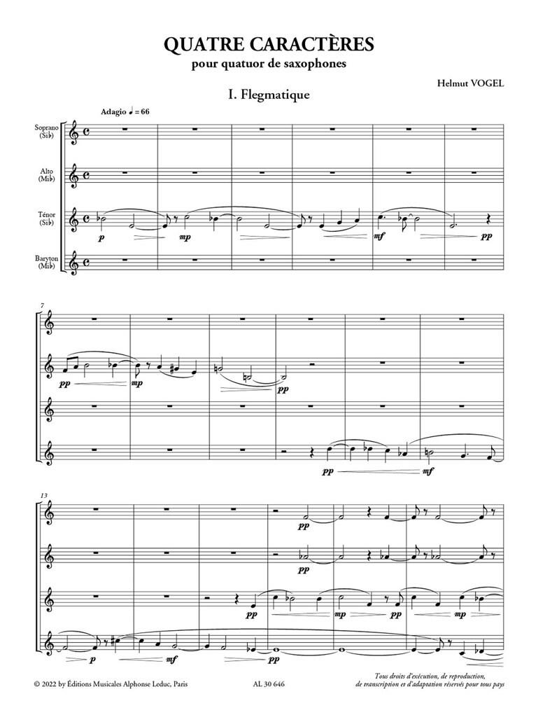 "In 'Quatre caractères' I seek to represent the four human temperaments in music, as well as the different colors and registers that are brought together in the saxophone quartet. The four movements are written in free form and should not only be associated with mental states but reflect gestural actions."" Helmut Vogel"