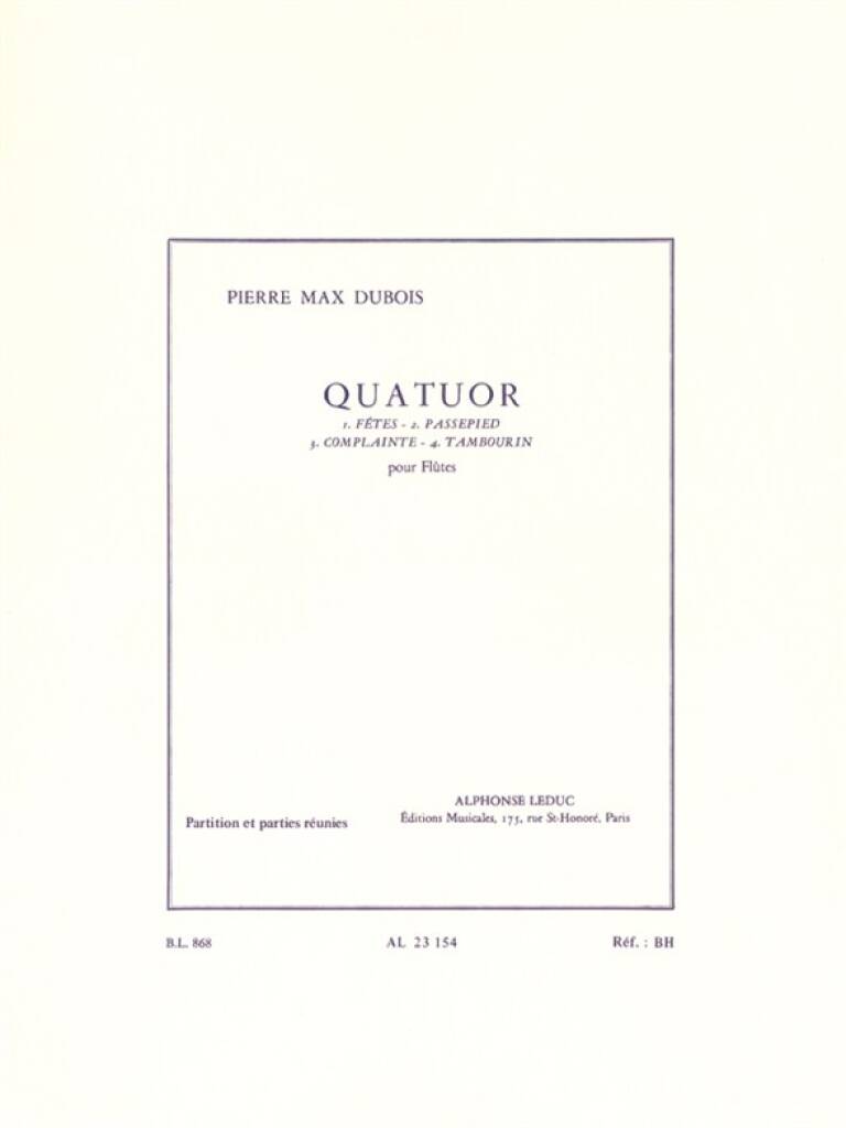 La musique pour quatuors pour flûtes étant le plus souvent réarrangée pour l’ensemble, il est rare qu’une œuvre soit initialement composée pour cette instrumentation précise. C’est pour cette raison que le Quatuor pour flûtes de Pierre Max Dubois a été considérablement bien accueilli. En tant qu’élève de Darius Milhaud, Dubois a apporté les idées des Six, dont Milhaud était membre, jusqu’au milieu des années 1900. Les compositions de Dubois sont caractéristiquement légères, avec des textures harmoniques et mélodiques intéressantes et inhabituelles, comme le montre ce Quatuor pour flûtes. Avec les quatre parties techniquement exigeantes, exploitant au maximum les techniques étendues, cette pièce offre une performance exigeante mais agréable. De plus, avec une partition complète et des parties séparées, cette édition est idéale. Avec peu de pièces pour cette instrumentation existant comme compositions originales, tous les quatuors pour flûtes doivent s’assurer d’essayer la pièce séduisante en quatre mouvements de Dubois.