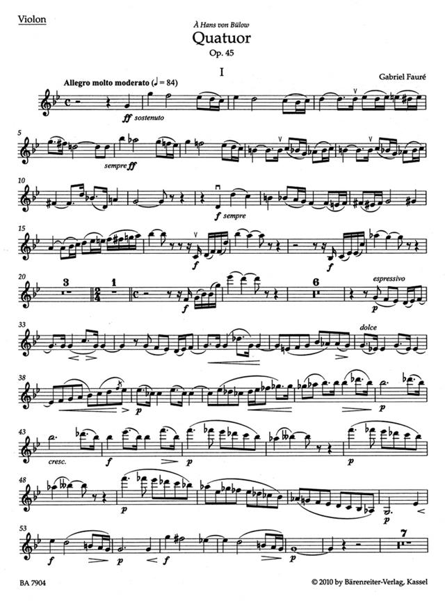 Le quatuor op. 45, probablement conçu en 1885, fut achevé en 1886 ou au début de l'année 1887, et parut vraisemblablement fin 1887 ou début janvier 1888: Fauré offrit un exemplaire à Tchaïkovski. Malgré ses valeurs intrinsèques op. 45 ne supplanta pas op. 15 et ne fut très connu qu'au cours du XXième siècle.