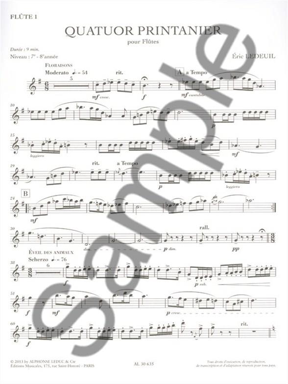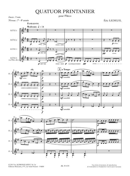 Born in 1970, Éric Ledeuil is a versatile musician, working as a flautist, composer, conductor and teacher. All his combined expertise has created this sublime ensemble work, Spring Quartet for Flute. Suitable for grade 7 and 8 standard flautists, Spring Quartet is made up of four sections; Blooms, Awakening Animals, Taking Flight and Spring Apotheosis. Spring Quartet is an exciting and varied addition to the Flute Quartet repertoire, essential to advanced flautists seeking to improve and expand their ensemble experience.