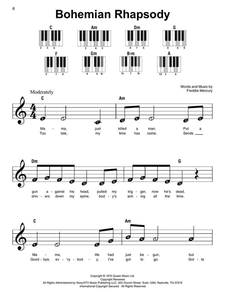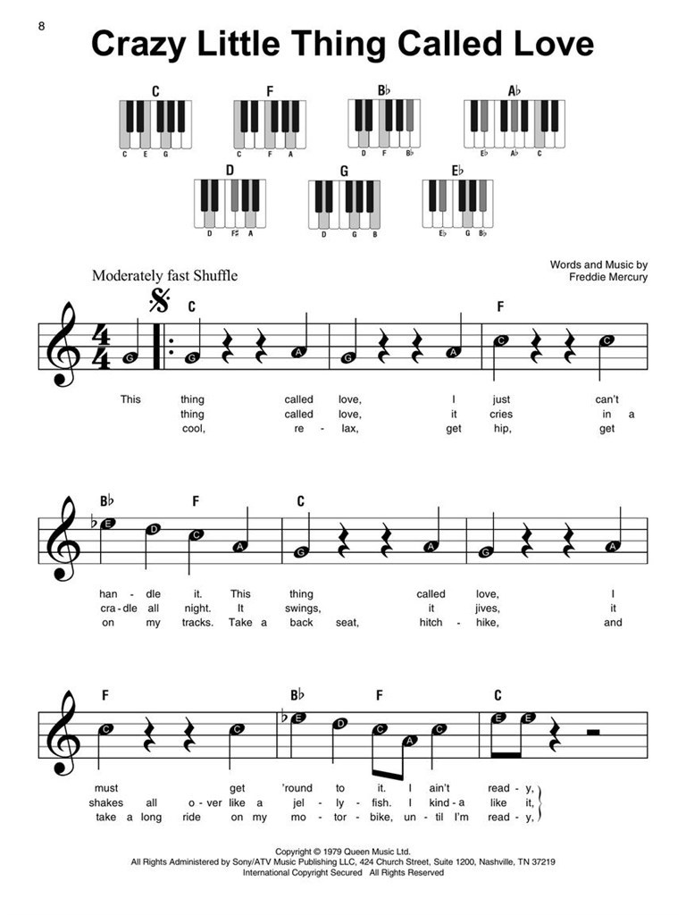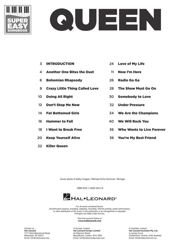 Playing piano is now super easy! This series features accessible arrangements for piano, with simple right-hand melody, letter names inside each note, basic left-hand chord diagrams, and no page turns! Perfect for beginning players of all ages. This edition features 20 Queen hits for beginners to enjoy: Another One Bites the Dust - Bohemian Rhapsody - Crazy Little Thing Called Love - Don't Stop Me Now - Killer Queen - Love of My Life - Radio Ga Ga - Somebody to Love - Under Pressure - We Are the Champions - We Will Rock You - You're My Best Friend - and more.Playing piano is now super easy! This series features accessible arrangements for piano, with simple right-hand melody, letter names inside each note, basic left-hand chord diagrams, and no page turns! Perfect for beginning players of all ages. This edition features 20 Queen hits for beginners to enjoy: Another One Bites the Dust - Bohemian Rhapsody - Crazy Little Thing Called Love - Don't Stop Me Now - Killer Queen - Love of My Life - Radio Ga Ga - Somebody to Love - Under Pressure - We Are the Champions - We Will Rock You - You're My Best Friend - and more.