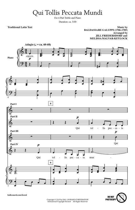 Introduce your treble choirs to the Baroque/Classical style of the Italian composer Baldassare Galuppi with this adagio movement filled with sorrowful descending lines and ardent suspensions. An excellent work for developing clarity of line and musicianship.
