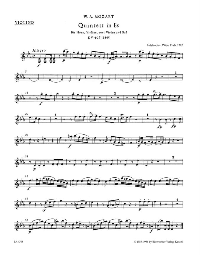 Quintett In Es Für Horn, Violine, 2 Violen Und Bass (Violoncello) MOZART WOLFGANG AMADEUS