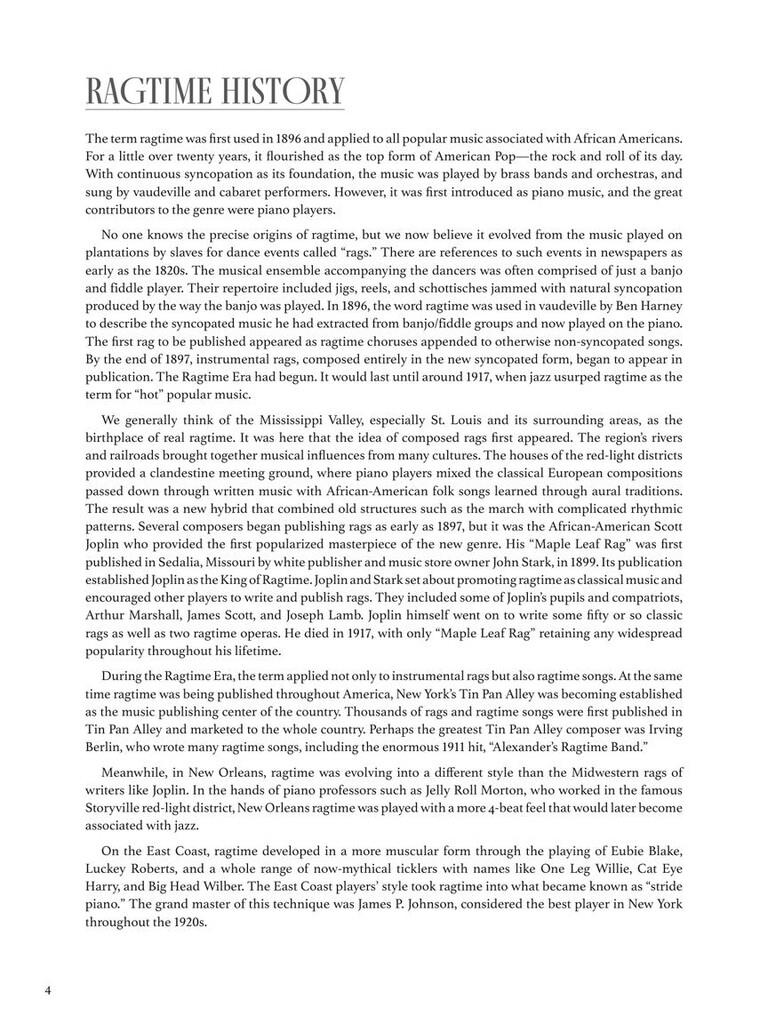 Includes: Easy-to-read, modern sheet music for some of the most popular rags, including “The Entertainer,” “Maple Leaf Rag,” and “Mississippi Rag;” Techniques for composing and arranging ragtime music; Performance considerations; Historical overview; and more!