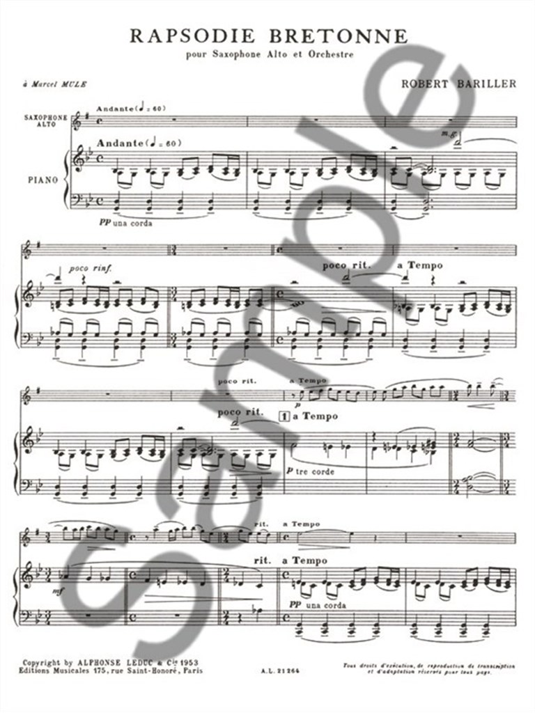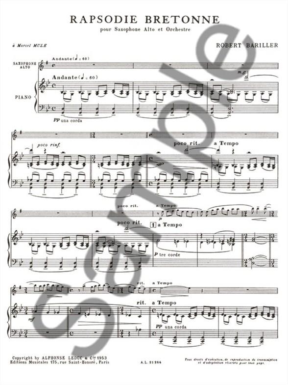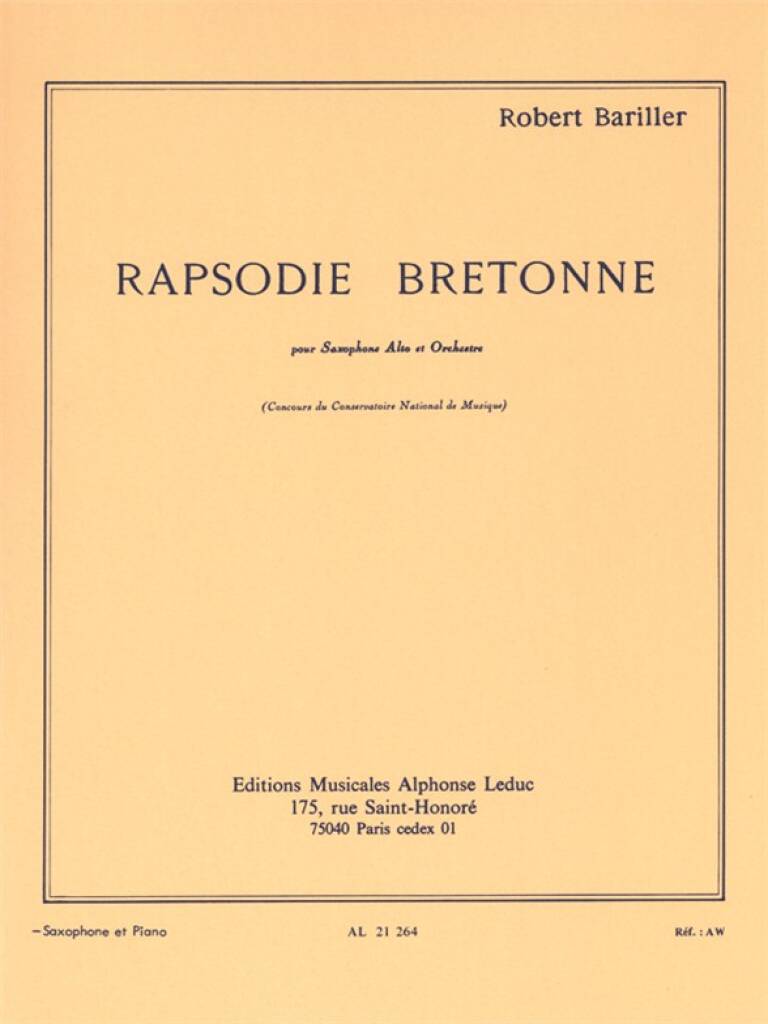 Saxophonist Robert Bariller 's understanding and virtuosity of his instrument led to the composition of his excellent Rapsodie Bretonne, suitable for advanced saxophonists. Published in 1953, Rapsodie Bretonne addresses virtuosic features of semiquaver flourishes, much variation in time sigantures and tempo, complex rhythm and articulation and wide intervals, amongst other aspects. Dedicated to Marcel Mule, Bariller 's Rapsodie Bretonne is an exciting and exquisite addition to the Alto Saxophone repertoire and is essential to advanced players of the instrument.