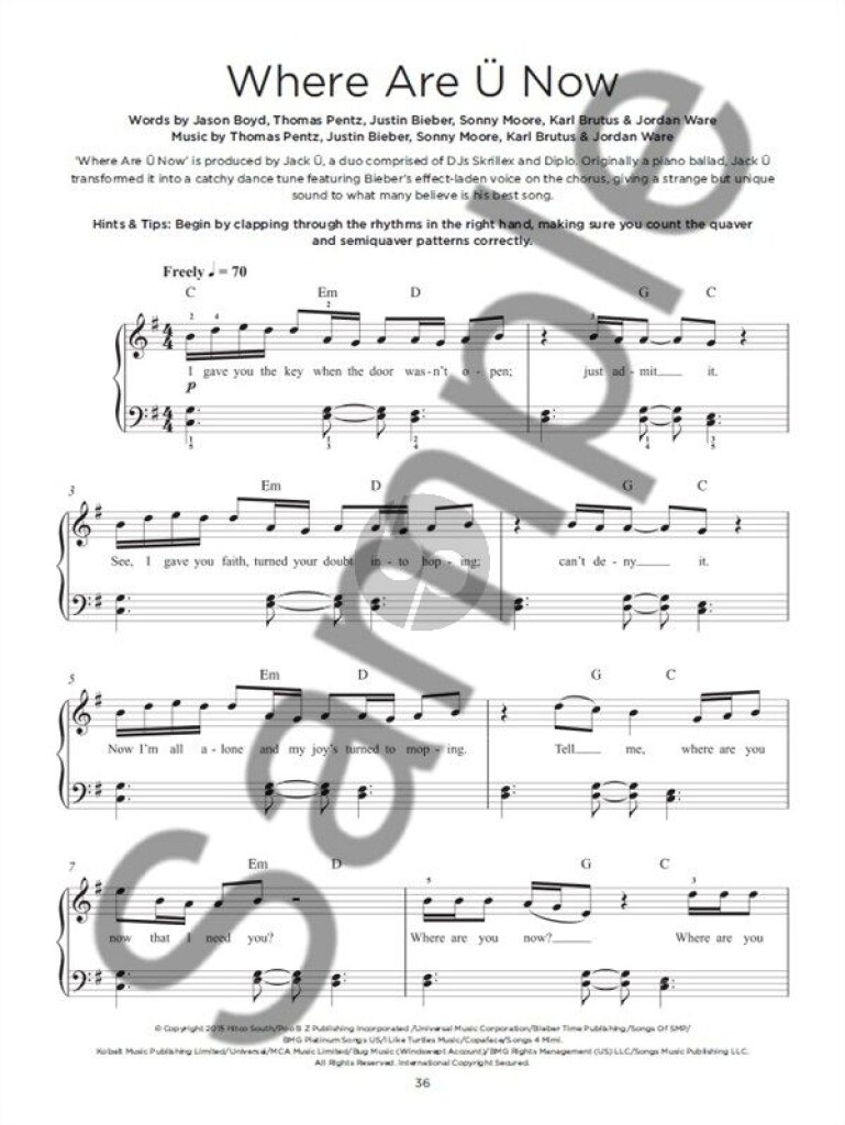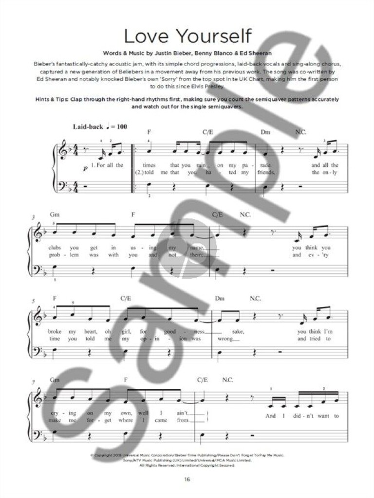 16 of Bieber's best songs are arranged here for easy piano, complete with informative song background notes, playing hints and tips. Each song includes chord names and fingering guidance throughout.