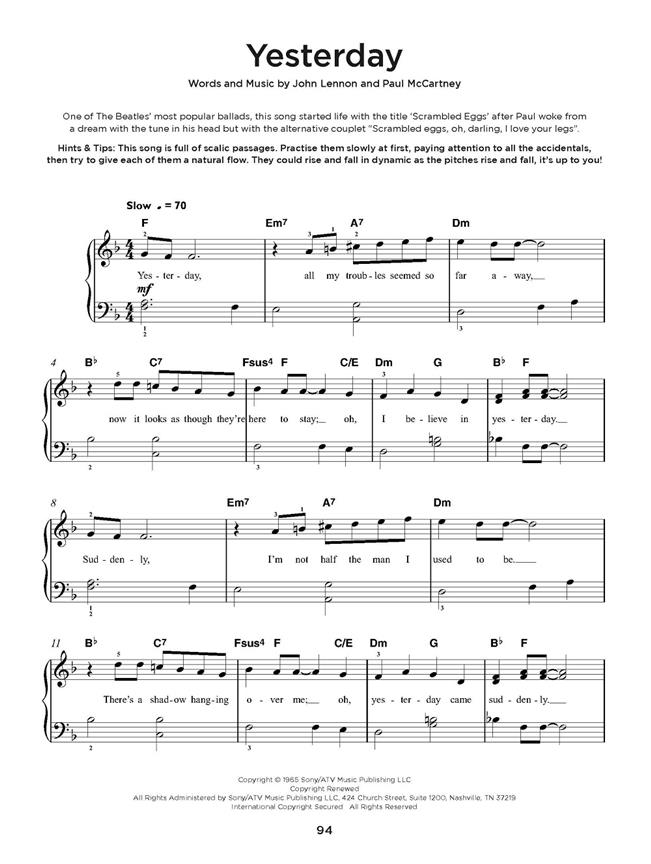 40 Beatles hits, including: ‘All You Need Is Love’, ‘Blackbird’, ‘Let It Be’, ‘Yesterday’ and more. The songs in this collection have been specially arranged for really easy piano with chord symbols and lyrics. Each song is presented with background notes and hints and tips to help you improve your performance!