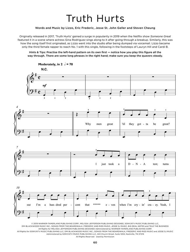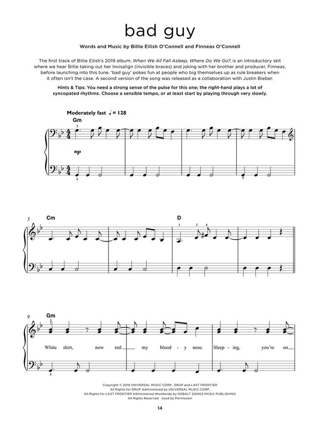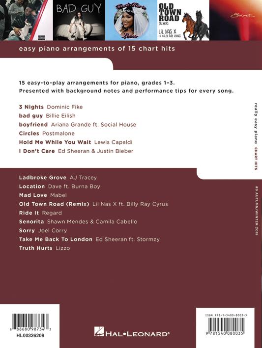 15 chart hits in easy-to-play arrangements for piano, grades 1-3. Presented with background notes and performance tips for every song. Includes hits such as 'Bad Guy', 'Ladbroke Grove', 'Truth Hurts' and many more!