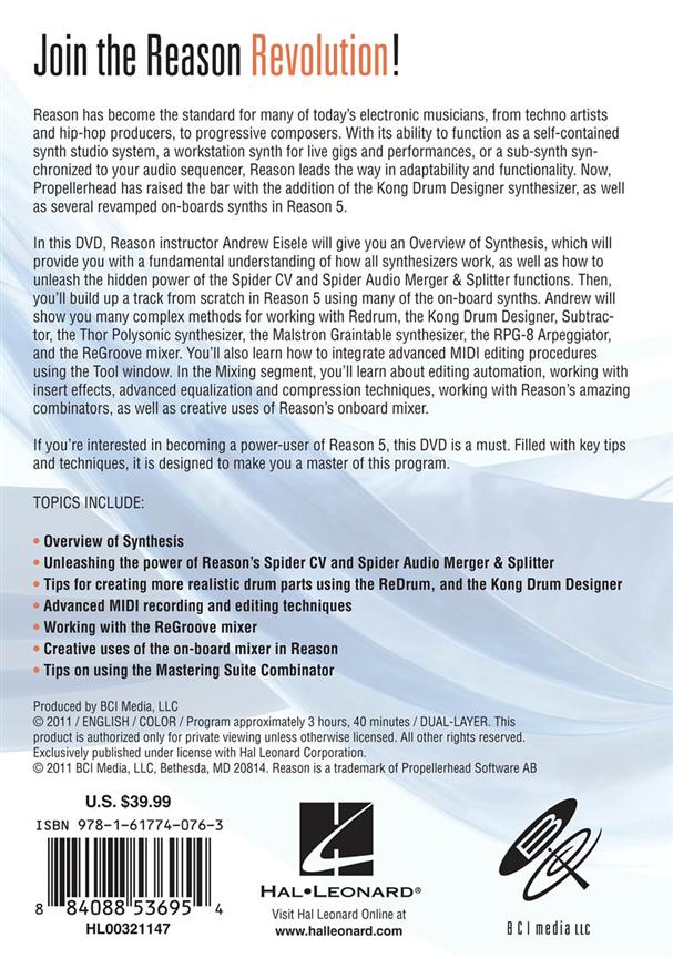 Ce DVD propose un aperçu de synthèse, qui vous donnera une compréhension fondamentale de la façon dont tous les travaux de synthétiseurs, ainsi que la façon d'exploiter la puissance cachée de la CV Spider et Audio Merger and Araignée fonctions Splitter. Ensuite, vous allez construire une piste à partir de zéro dans Reason 5 à l'aide de nombreux synthés à bord. Andrew va vous montrer beaucoup de méthodes complexes pour travailler avec Redrum, le concepteur Kong Drum, Subtractor, le synthétiseur Thor Polysonic, le synthétiseur Malstron Graintable, l'arpégiateur RPG-8, et le mélangeur recreuser. Vous apprendrez également comment intégrer procédures avancées d'édition MIDI en utilisant la fenêtre de l'outil. Dans le segment de mixage, vous apprendrez à éditer l'automatisation, le travail avec des effets d'insertion, l'égalisation de pointe et des techniques de compression, en travaillant avec des combinateurs étonnant Reason, ainsi que des utilisations créatives de mélangeur à bord de Reason. Si vous êtes intéressé à devenir un power-user de la raison 5, ce DVD est un must! 3 heures, 40 min.