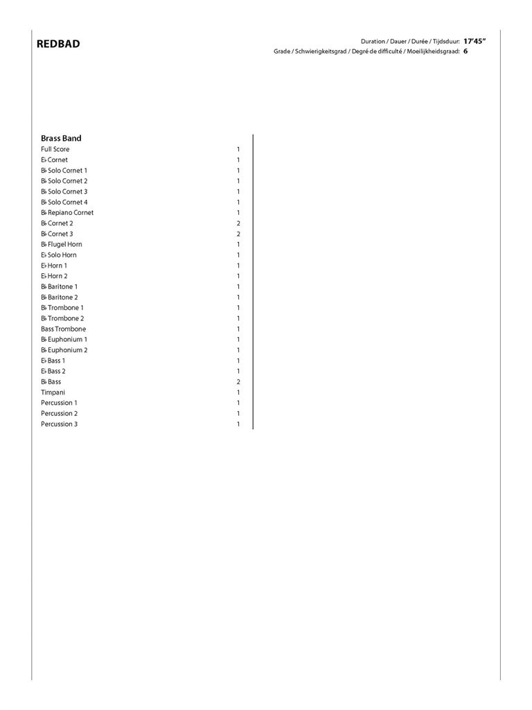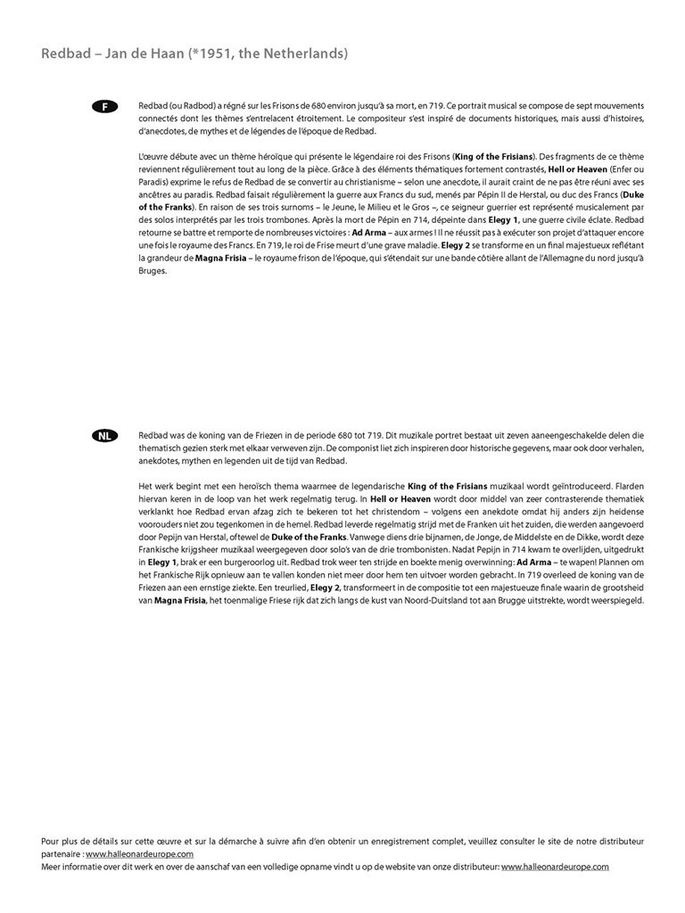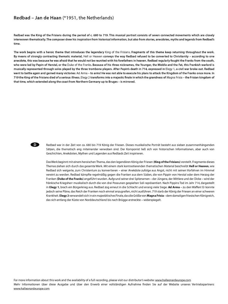 Redbad est une composition écrite pour la catégorie « Championnat » des Championnats néerlandais des Brass Bands – elle contient donc de nombreux challenges musicaux et techniques. Dans cette œuvre en sept mouvements connectés, nous faisons la connaissance de Redbad (ou Radbod), roi de Frise de 680 environ jusqu’à sa mort, en 719. Le compositeur s’est inspiré de documents historiques, mais aussi d’histoires, d’anecdotes, de mythes et de légendes relatifs à ce personnage. Les thèmes de cette pièce s’entrelacent étroitement, mais la musique est variée et attrayante – entre des motifs héroïques et la mélancolie des élégies, des passages en tutti alternent avec des fragments aux sonorités plus ouvertes où divers musiciens sont mis en vedette. Pour couronner le tout, la pièce s’achève avec un final majestueux.