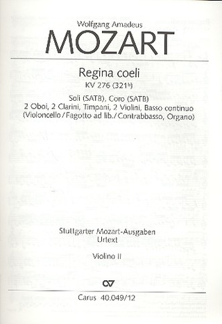 Contrairement aux deux mises en musique « Regina coeli » K. 74 et 127, qui sont écrites pour soprano solo et chœur, Mozart utilise le quatuor de solistes en K. 276, qui, comme dans les messes de Salzbourg, ne dialogue souvent avec le chœur que dans de courtes interjections. De plus, le décor actuel ne comprend qu’un seul mouvement, tandis que les deux autres comportent plusieurs mouvements contrastés.