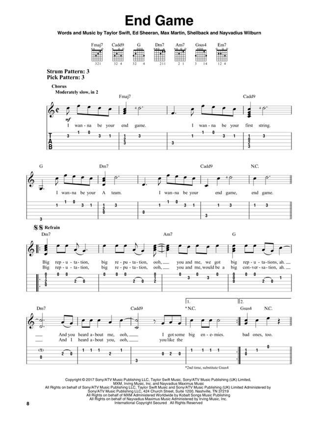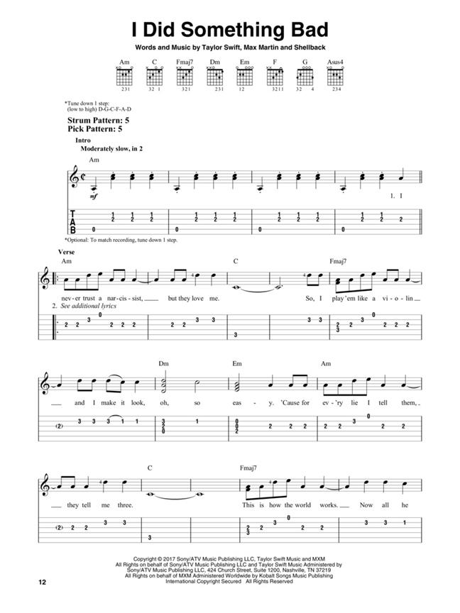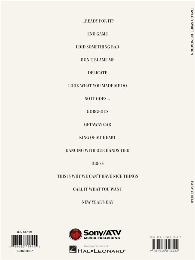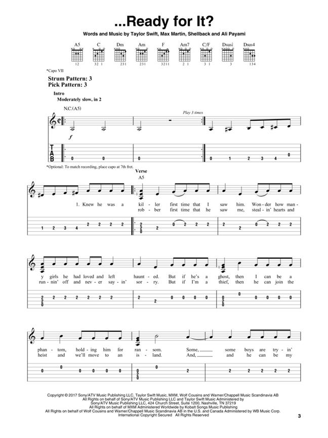 ...Ready for It.” Our songbook features these plus 12 more: Call It What You Want - Dancing with Our Hands Tied - Delicate - Don't Blame Me - Dress - Getaway Car - Gorgeous - I Did Something Bad - King of My Heart - New Year's Day - So It Goes... - This Is Why We Can't Have Nice Things. Songs are arranged for easy guitar in notes and tab with lyrics and chord frames and include suggested strum and pick patterns.