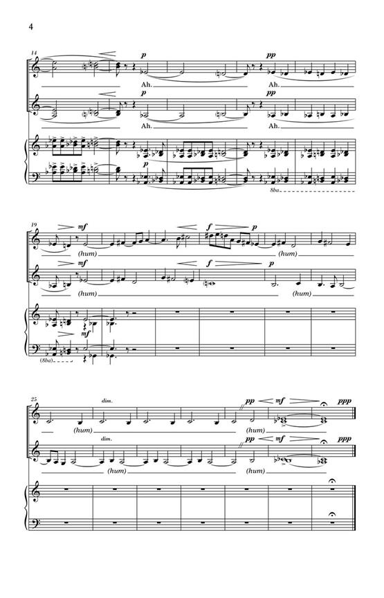 Le compositeur américain William Schuman (1910-1992) a écrit des œuvres dans pratiquement tous les genres musicaux, chacun reflétant sa forte personnalité par leur sens net de la structure, de la ligne et du dynamisme. Cette courte composition sans paroles pour chœur de femmes et piano date de 1942 et a été écrite pour le Sarah Lawrence Chorus.