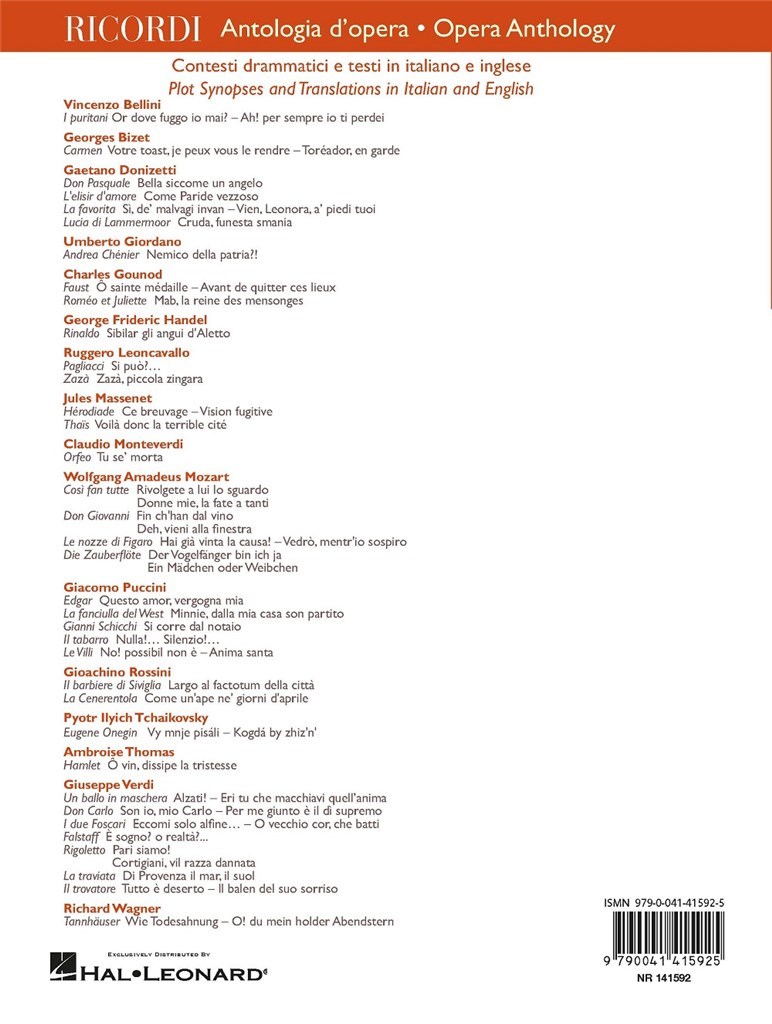 A selection of 40 arias for voice and piano with plot synopses and translations in Italian and English.