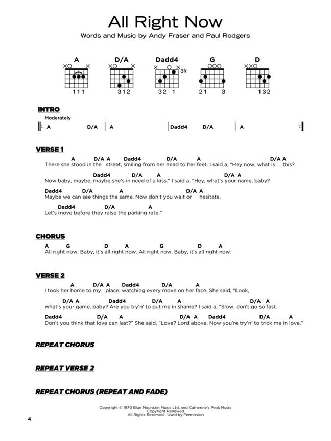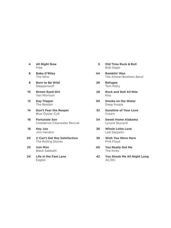 Easy-to-follow charts to get you playing right away are presented in this collection for all guitarists. Includes 22 songs in chords, lyrics and basic tab: All Right Now · Born to Be Wild · Don't Fear the Reaper · Hey Joe · Iron Man · Old Time Rock and Roll · Refugee · Sweet Home Alabama · You Shook Me All Night Long · and more.