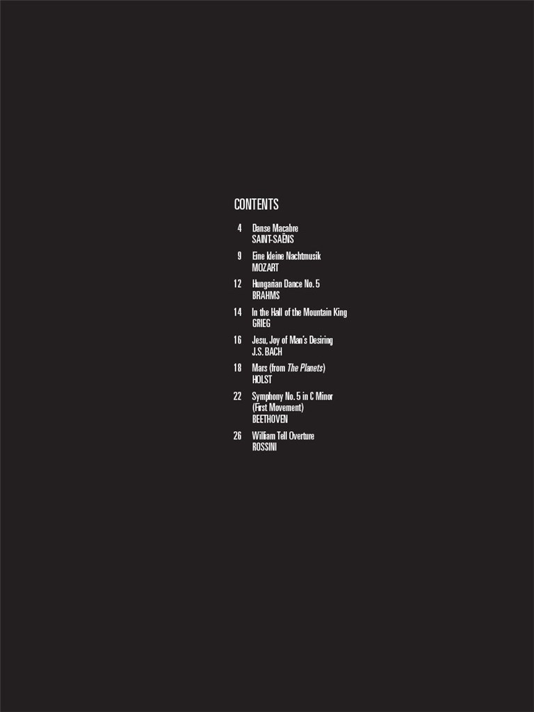 This volume features eight classical favorites: Danse Macabre (Saint-Saëns) - Eine Kleine Nachtmusik (Mozart) - Hungarian Dance #5 (Brahms) - In the Hall of the Mountain King (Grieg) - Jesu, Joy of Man's Desiring (J.S. Bach) - Mars (Holst) - Symphony #5 in C Minor, First Movement Excerpt (Beethoven) - William Tell Overture (Rossini).