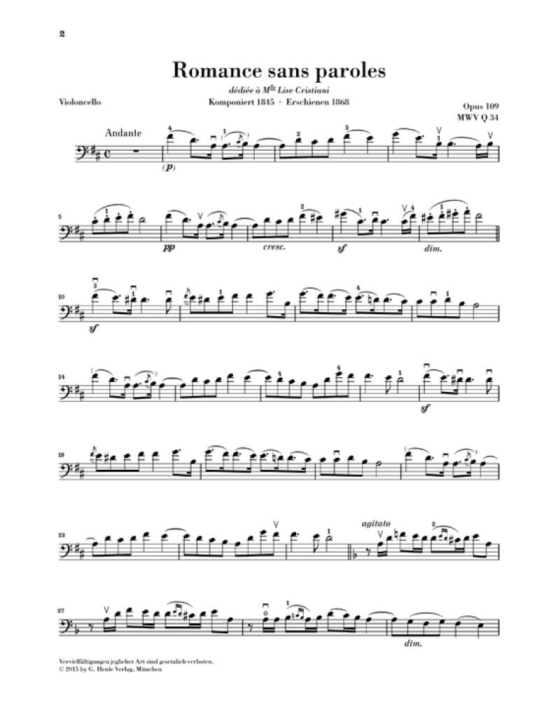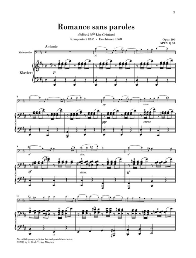 Le « Romance sans paroles dédiée à Mlle. Lise Christiani » – le texte de l’autographe conservé – ne fut publié qu’en 1868 par la succession du compositeur sous le titre op. 109. La violoncelliste française Lise Christiani donna plusieurs concerts à Leipzig en octobre 1845, où elle rencontra Mendelssohn et commanda vraisemblablement la composition de cette charmante pièce. C’est la seule « Chanson sans mots » que Mendelssohn n’a pas écrite pour piano solo, mais pour deux instruments. Auparavant disponible uniquement dans l’anthologie HN 669 avec d’autres pièces pour cet instrument, le « Romance sans paroles », extrêmement populaire auprès des violoncellistes, est désormais également disponible en une seule édition dans l’Urtext de Henle.