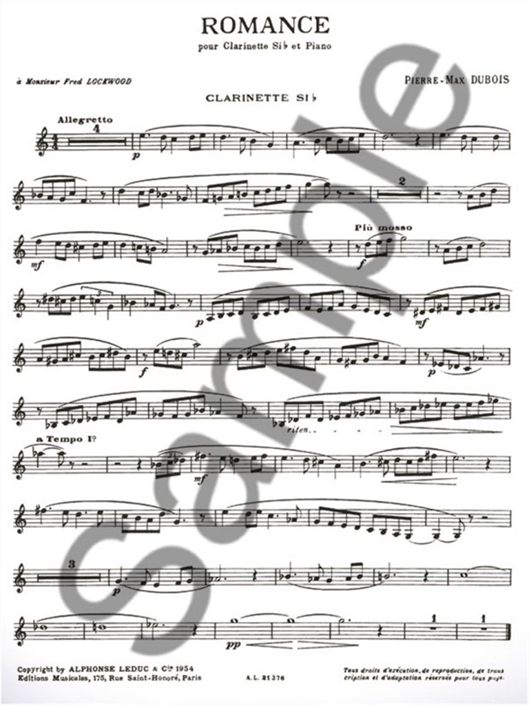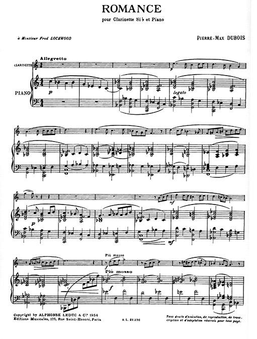 Composed by Pierre-Max Dubois, Romance is a piece for Bb Clarinet and Piano accompaniment, dedicated to Fred Lockwood. This melodious piece is perfect for intermediate players. Interesting for both players and for the audience, it is a nice piece to play during a recital. Starting with the Piano, the Clarinet begins with the main theme after four measures, ; Allegretto. Then follows a section ; Piú Mosso, which is quite lyrical, before the main theme is played again, leading to the harmonious Piano finale. Pierre Max Dubois (1930-1995) was a French composer who was awarded thePrix de Rome in 1955. Mainly composing classical music, his works are mainly for woodwinds. He is one of the founder of the Les Six and which included his professor, Darius Milhaud.