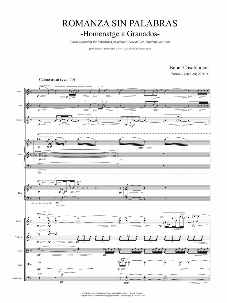 The present work was commissioned by the Foundation for Iberian Music (Graduate Center of the University of New York) as a tribute to Enric Granados on the occasion of the composer's centenary celebration in New York. The general character of the piece, in which the cantabile register dominates, responds faithfully to its title (A Song without Words) and its form refers to a Lied arrangement in three parts. The first of these, in the form of a serene and contemplative introduction, gives way to more lively and agitated central episodes, whose rhythmic vivacity and scherzandi accents coexist with a certain dramatism, and where there is no lack of a passionate and luminous appeal to the name of Granados, in the form of a musical acrostic made up of the notes E-C (Enric) and G-A-D-(e)S (Granados). All this leads to the final part, of a more lyrical nature, which culminates in the concluding Andantino semplice, in the manner of a dreamed popular song and which constitutes the emotional climax of the work, which concludes on ecstatic resonances, until it fades into silence. The premiere of the work took place on 10 March 2016 at Elebash Recital Hall in New York by the Perspectives Ensemble, conducted by Ángel Gil-Ordóñez. The work is dedicated to Maneleta Domingo, María Lourdes Antràs and Virginia Casablancas.