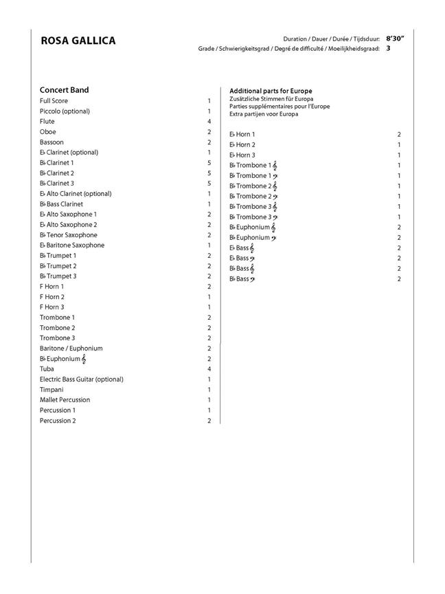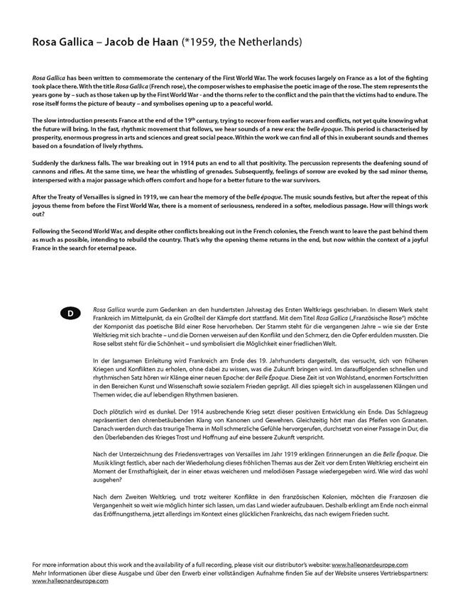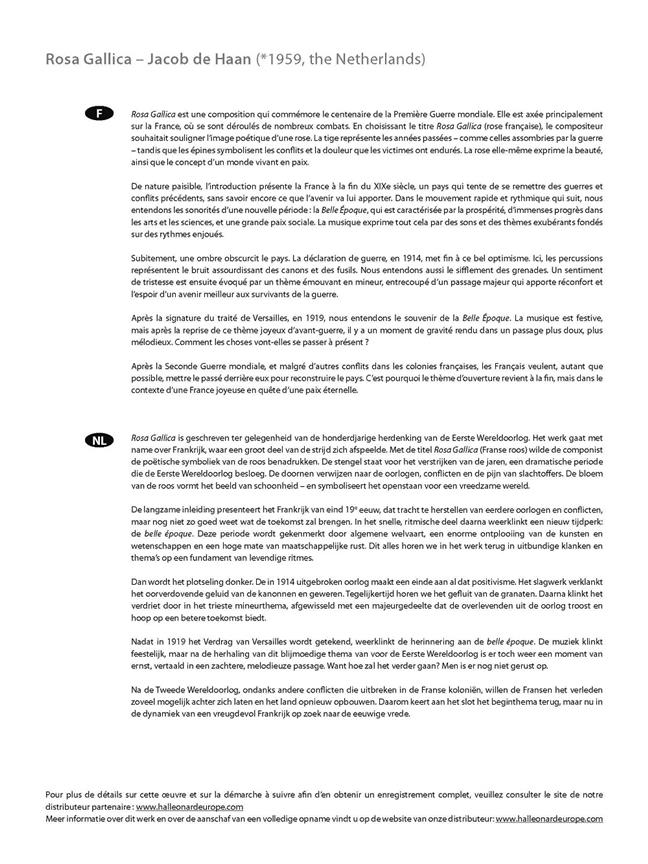 Rosa Gallica est une composition qui commémore le centenaire de la Première Guerre mondiale. Elle est axée principalement sur la France, où se sont déroulés de nombreux combats. En choisissant le titre Rosa Gallica (rose française), le compositeur souhaitait souligner l’image poétique d’une rose. La tige représente les années passées comme celles assombries par la guerre tandis que les épines symbolisent les conflits et la douleur que les victimes ont endurés. La rose elle-même exprime la beauté, ainsi que le concept d’un monde vivant en paix. Cette pièce dépeint la France la fin du XIXe siècle, puis son rôle au cœur de la Première Guerre mondiale et au-del. Une nouvelle oeuvre dramatique et originale de Jacor de Haan.