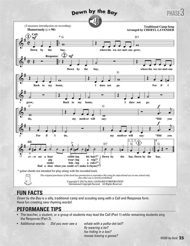 Il comprend les échos de mouvement et de percussion, tours et canons- chanoines de la parole- d'appel et de réponse chansons et rondes- chansons et des canons. Le tour du monde est aussi une collection multiculturelle afin que les étudiants peuvent profiter de la musique de leurs frères et soeurs du monde, et ont une meilleure compréhension de leurs histoires et de traditions culturelles.