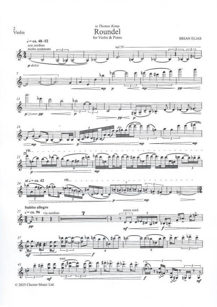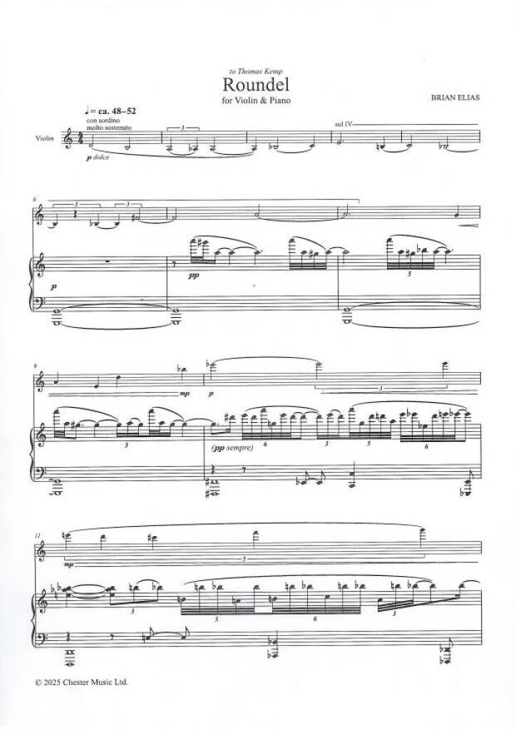 Roundel est une courte œuvre pour violon et piano, dédiée au violoniste Thomas Kemp, qui a créé l’œuvre avec Huw Watkins en 2025