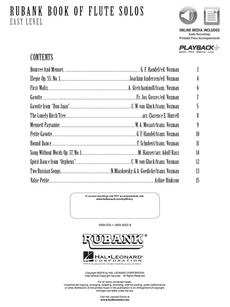 Cette compilation de 13 solos de flûte issus de la légendaire bibliothèque éducative Rubank inclut désormais un accès en ligne à : pistes audio en représentation complète et accompagnement uniquement, fichiers PDF d’accompagnement de piano PLAYBACK+ Un lecteur audio multifonctionnel qui permet d’ajuster le tempo sans changer de hauteur, de changer de tonalité et de créer des boucles d’entraînement - disponible exclusivement chez Hal Leonard. Sommaire : « Bourree et Menuet » (Haendel), « Élégie, Op. 55 n° 1 » (Andersen), « Première valse » (Gretchaninoff), « Gavotte » (Gossec), « Gavotte de Don Juan » (Gluck), « Bouleau solitaire », « Menuett Paysanne » (Mozart), « Petite Gavotte » (Haendel), « Danse ronde » (Schubert), « Chanson sans mots » (Hauser), « Danse des esprits d’Orphée » (Gluck), « Deux chansons russes », « Valse Petite » (Hinkson).