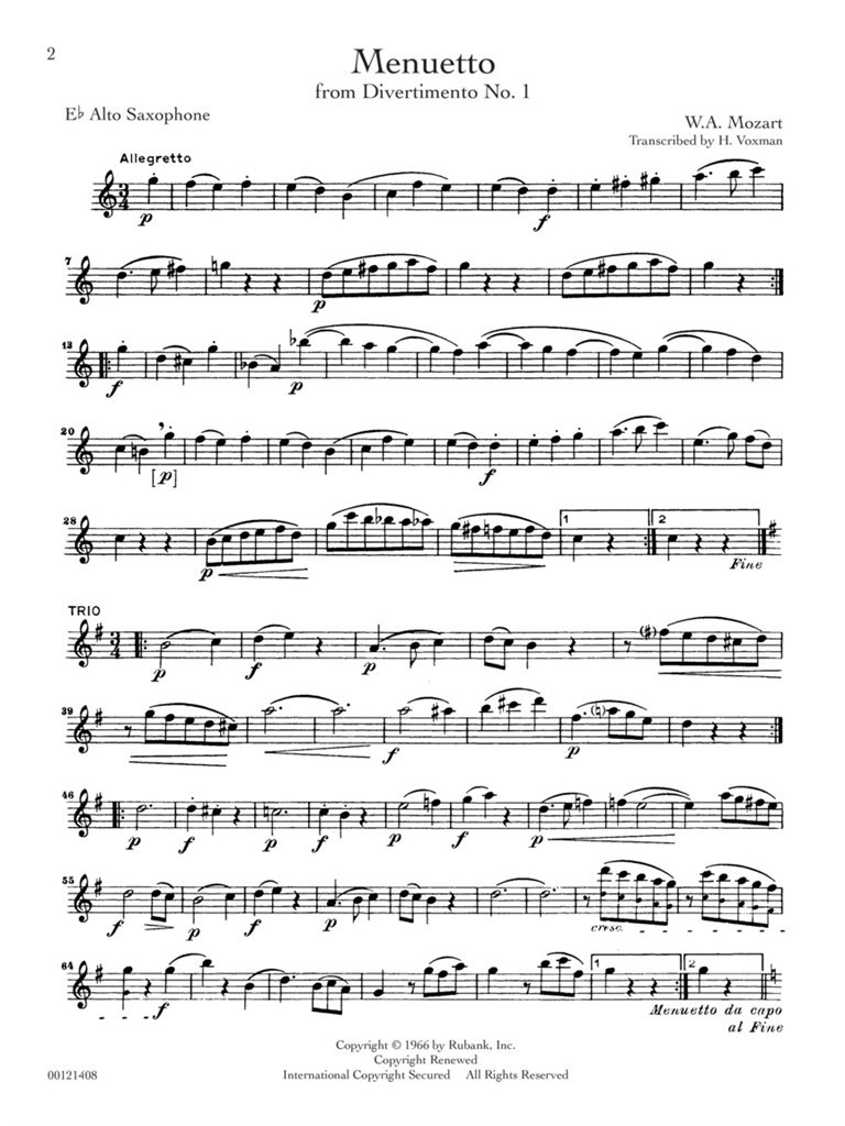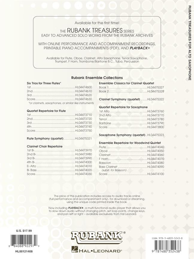 Available for the first time: easy to advanced solo works from the Rubank archives with online performance and accompaniment recordings, printable piano accompaniments, and PLAYBACK+ audio tools. This new collection of 13 Rubank solos includes many that have long been unavailable. All are suitable for contest and festival performance (grades 2-4). Purchase includes exceptional performance tracks (recorded by pro players), accompaniment tracks for practice, and PDF piano accompaniments for use at contest. Includes: Adoration (Borowski) - American Patrol (Meacham) - Andante and Allegro from Sonata in G (Marcello) - Ave Maria (Schubert) - Concertino, Op. 26 (Weber) - Menuetto (Mozart) - Non tanto adagio (Platti) - Pavane pour une Infante Defunte (Ravel) - Presto from Concerto in E Minor, Op. 102 (Gurewich) - Presto from Suite for Alto Saxophone (Ostransky) - Recitative and Rondino (Koepke) - Sarabande and Gigue (Corelli) - Slavonic Fantasy (Heumann).