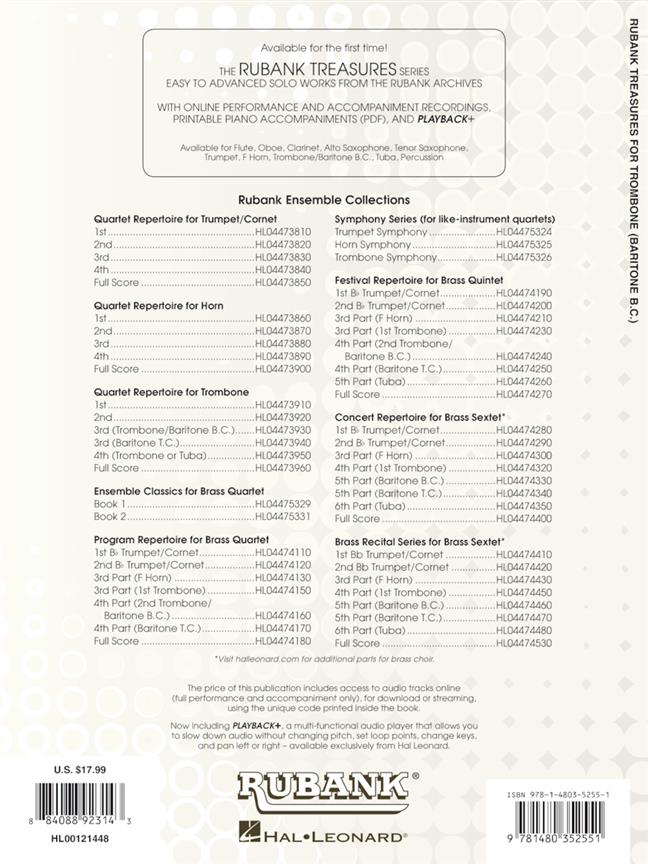 Available for the first time: easy to advanced solo works from the Rubank archives with online performance and accompaniment recordings, printable piano accompaniments, and PLAYBACK+ audio tools. This new collection of 14 Rubank solos includes many that have long been unavailable. All are suitable for contest and festival performance (grades 2-4). Purchase includes exceptional performance tracks (recorded by pro players), accompaniment tracks for practice, and PDF piano accompaniments for use at contest. Includes: Air and Variation on a Civil War Song ("Tramp, Tramp, Tramp”) (Root) - Air Gai (Berlioz) - American Patrol (Meacham) - Andante and Allegro (Clérisse) - Aria and Allegro (Haydn) - Ave Maria (Schubert) - Concerto in F Minor (Lauga) - Jabberwocky (Walters) - Lyric Interlude (Johnson) - Orientale (Barat) - Prayer (Mascagni) - Prelude et Divertissement (Clérisse) - Summer Serenade (Hurrell) - Toreadors Song (Bizet).