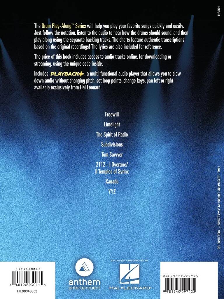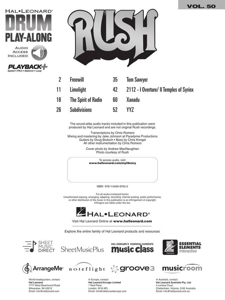 Trois nouvelles éditions pour les fans du groupe de rock Rush ! Les guitaristes et les bassistes, réveilleront l'Alex Lifeson ou le Geddy Lee qui sommeille en eux, tandis que les batteurs apprendront les techniques de Neil Peart grâce à ces superbes compilations qui vous permettront de jouer avec les enregistrements d’accompagnement de 8 grands classiques de Rush ! Les partitions comportent des transcriptions exactes, approuvées par les artistes et basées sur les enregistrements originaux. La mélodie et les paroles sont incluses pour chanter vos tubes préférés. Le prix de ces Play-Alongs comprend l'accès aux pistes audio en ligne, à télécharger ou à écouter en streaming, en utilisant le code unique qui se trouve à l'intérieur de l'ouvrage. Également inclut : PLAYBACK+, un lecteur audio multifonctionnel qui vous permet de ralentir l'audio sans changer la hauteur, de définir des boucles, de changer de tonalité et d'effectuer un panoramique vers la gauche ou vers la droite - disponible exclusivement chez Hal Leonard. Titres inclus dans ces éditions : Freewill - Limelight - The Spirit of Radio - Tom Sawyer - 2112-I Overture - 2112-II The Temples of Syrinx - Xanadu